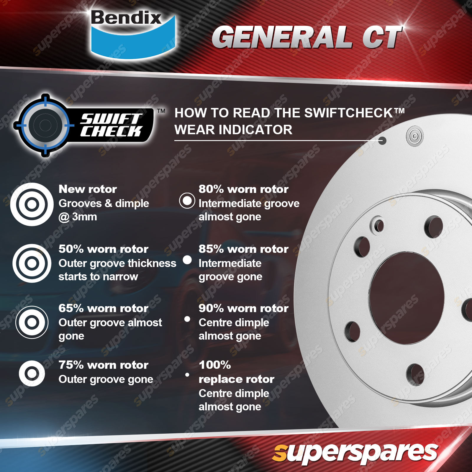 Bendix General CT™ Rotors are designed to provide reliable, durable and confidence inspiring braking performance for 'everyday' vehicles. * Award-winning disc brake rotors * Introducing industry-first SwiftCheck™ * Original Equipment Fit |