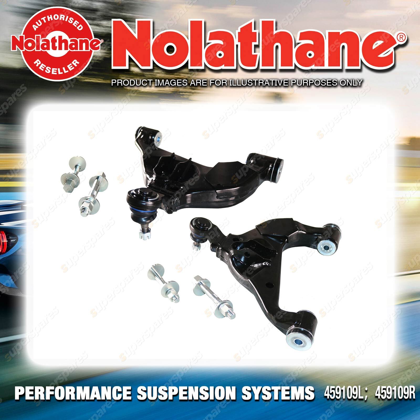 Contents : Nolathane Control Arm Lower - Arm Position : Front Warranty : 3 Year / 60,000Kms Kit Contents : 2 Arm(Left & Right), 4 Camber Bolts, Install Guide |
