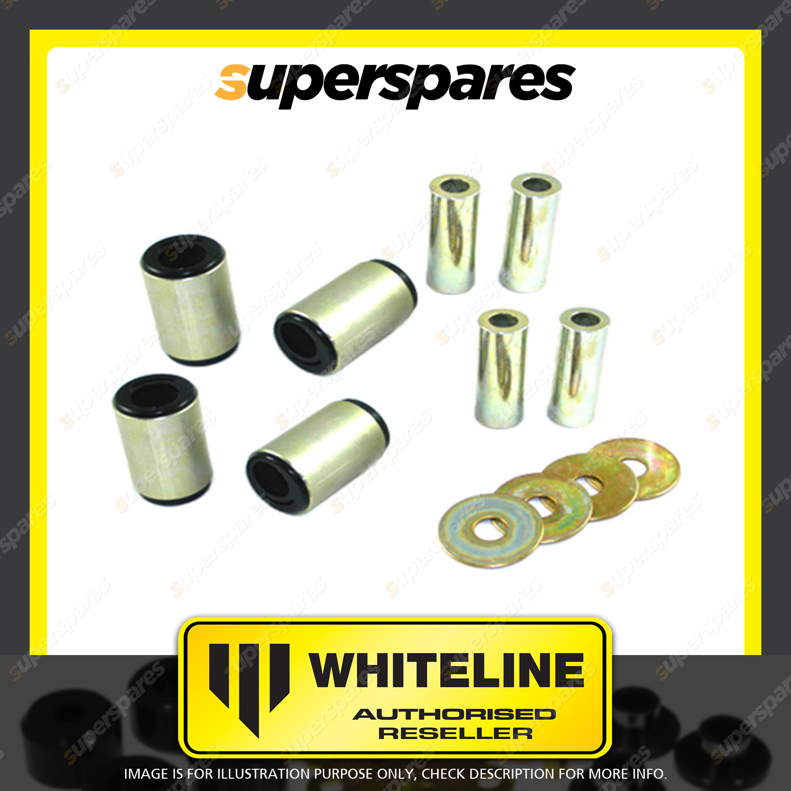 | Contents : Whiteline Front Control arm - lower inner bushing Warranty : 3 Year / 60,000Kms Kit Contents : 4 Shell Bushings, 4 Tubes, 8 Washers, Install Guide, Grease | Kit Specifications : Bush Qty : 4 |