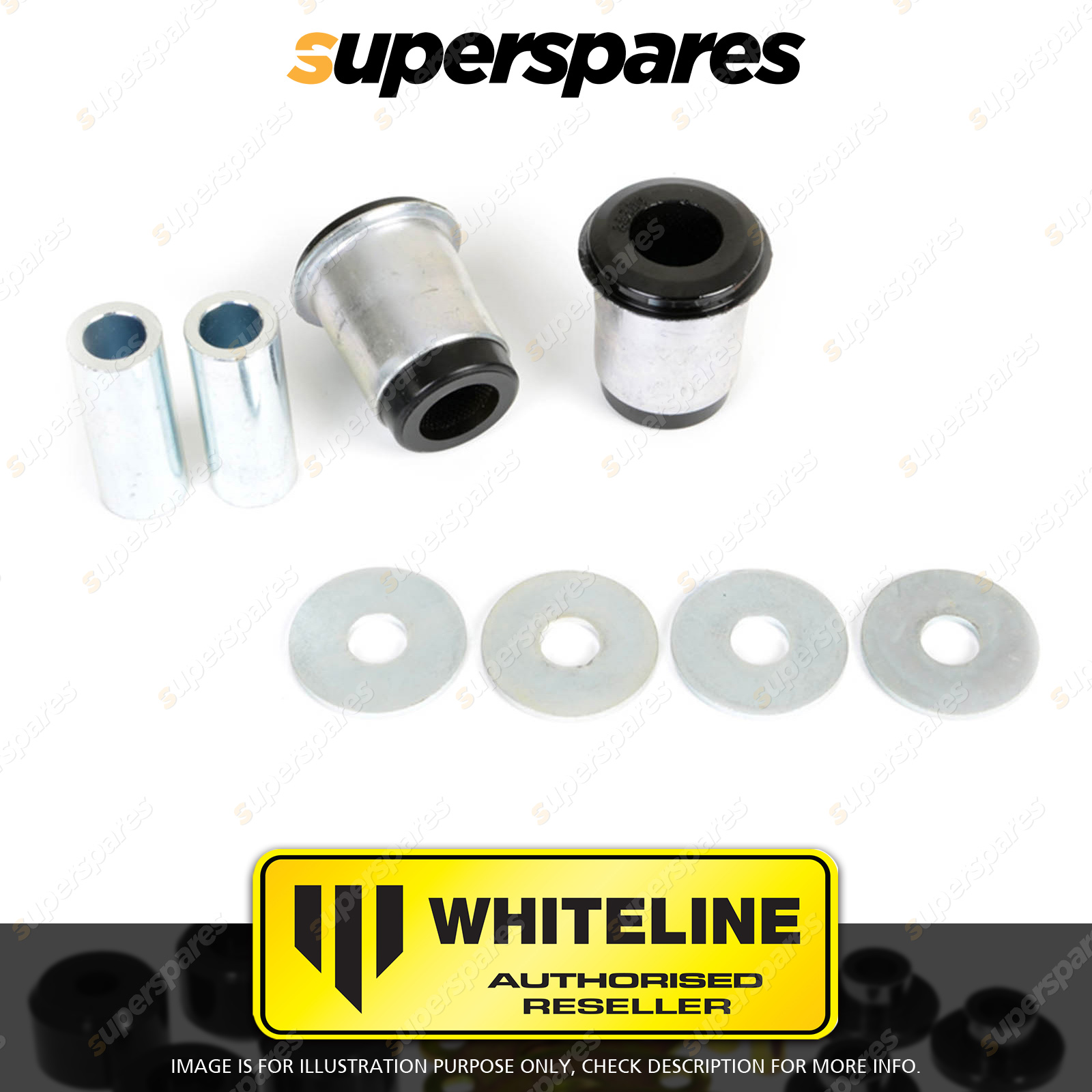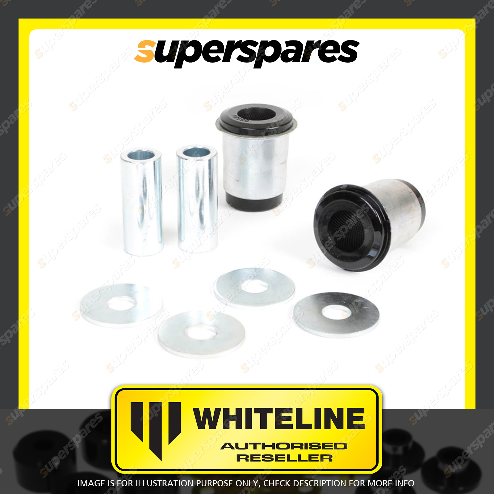 | Contents : Whiteline Front Control arm - lower inner bushing Warranty : 3 Year / 60,000Kms Kit Contents : 2 Shell Bushings, 2 Tubes, 4 Washers, Grease |