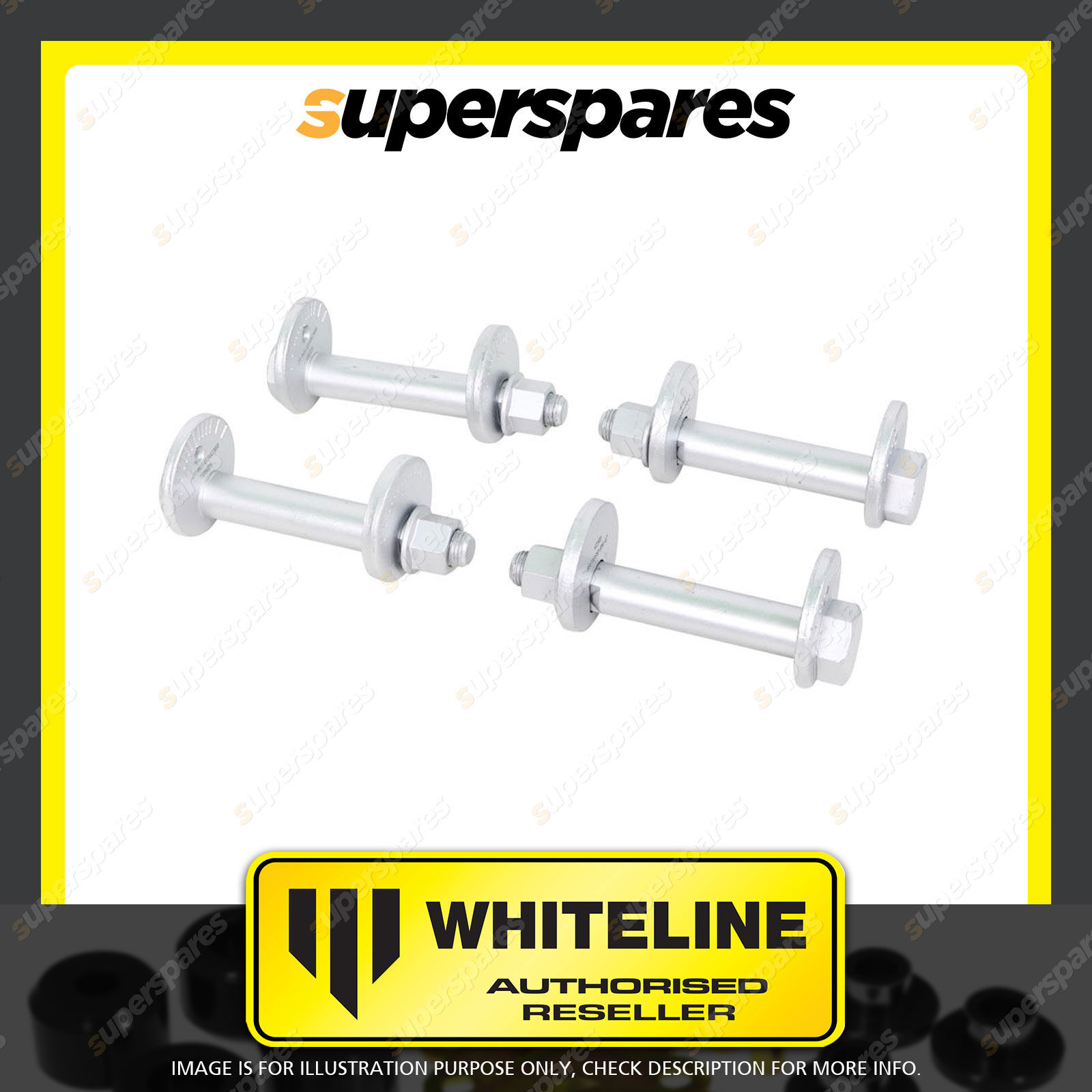 | Contents : Whiteline Front Control Arm Lower Inner Camber Bolt Kit Warranty : Lifetime Kit Contents : 4 Bolts, 4 Washers, 4 Nuts |