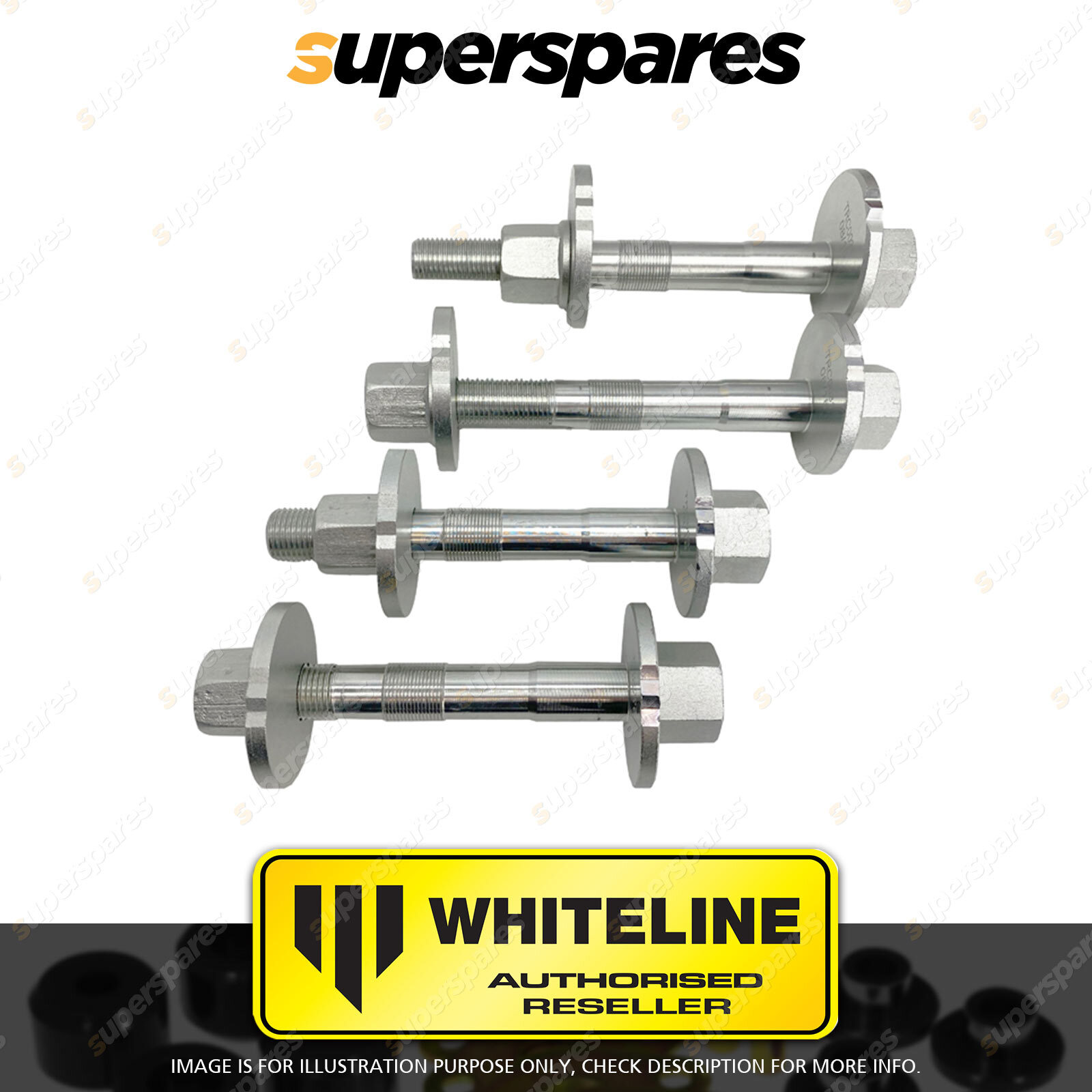 Contents : Whiteline Control Arm Lower - Inner Camber Bolt Kit Position : Front Warranty : 3 Year / 60,000KMS Kit Contents : 4 Bolts, 4 Washers, 4 Nuts |