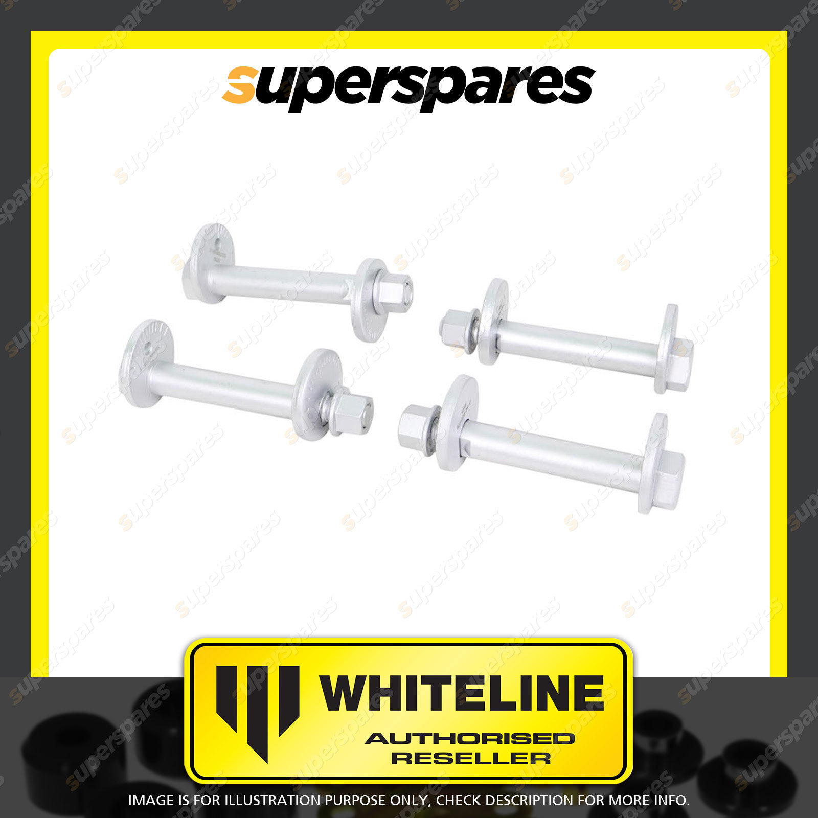 | Contents : Whiteline Front Control Arm Lower - Inner Camber Bolt Kit Warranty : Lifetime Kit Contents : 4 Bolts, 4 Washers, 4 Nuts |