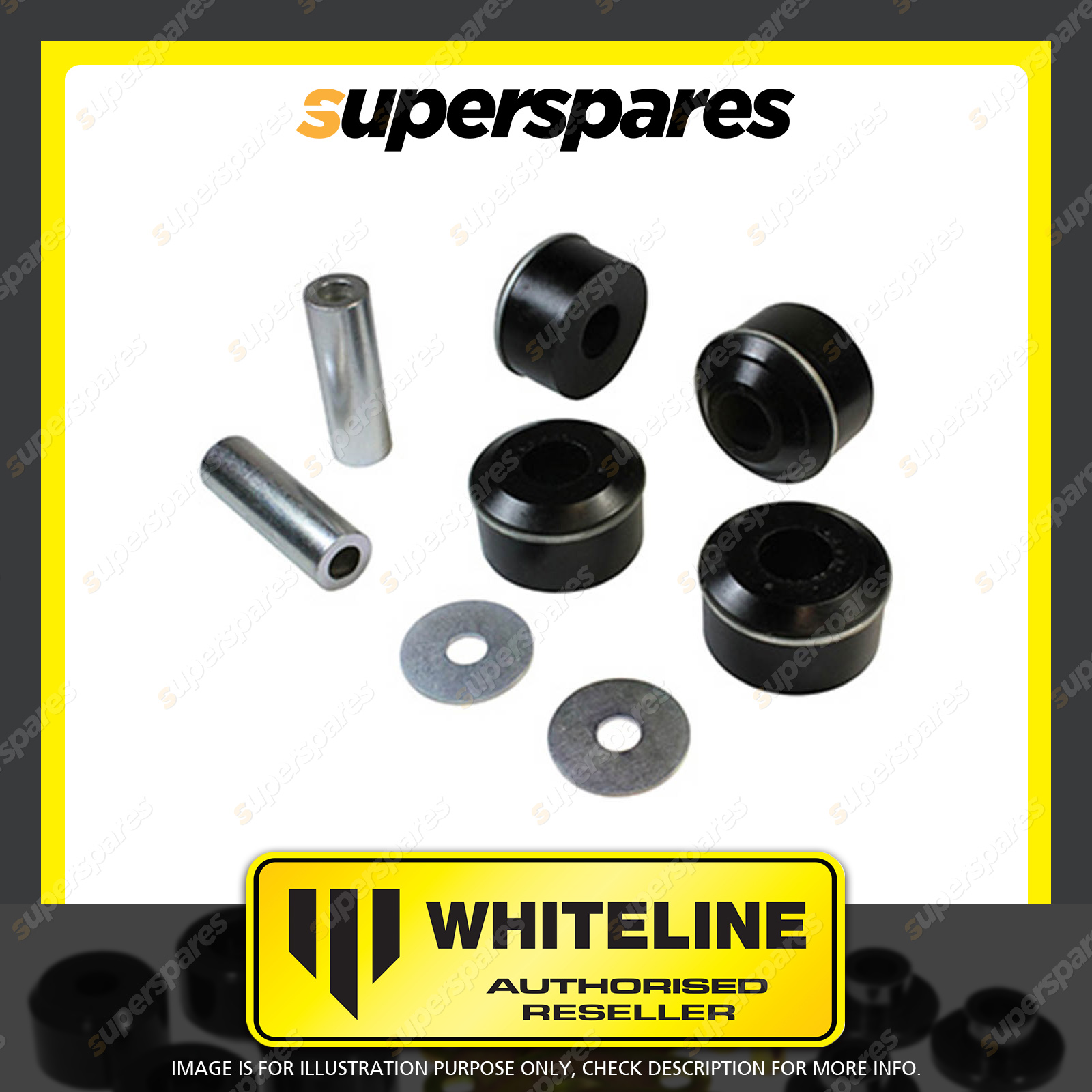 | Contents : Whiteline Front Control arm - lower inner Front bushing Warranty : 3 Year / 60,000Kms Kit Contents : 4 Bushings, 2 Tubes, 2 Washers, Install Guide, Grease |