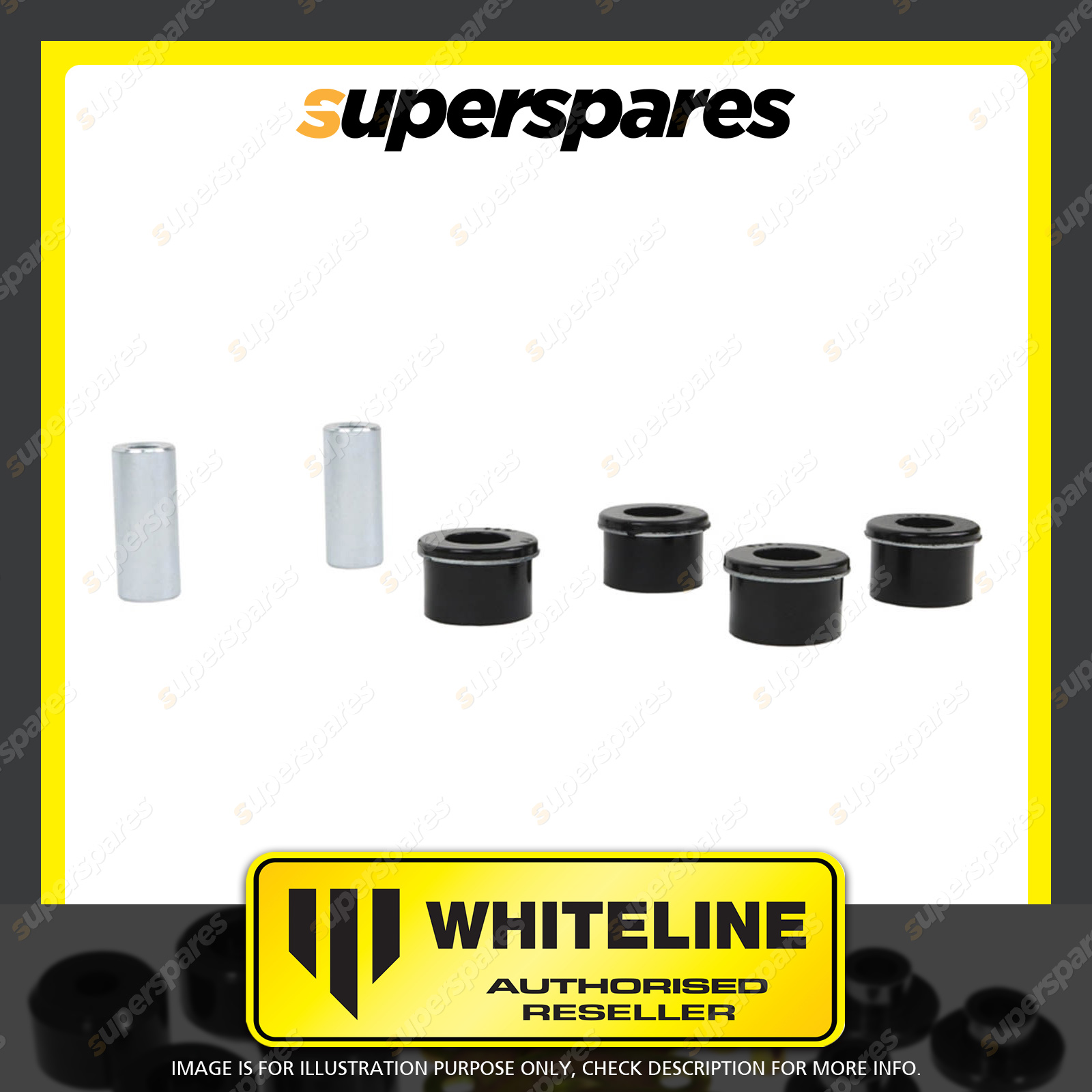 | Contents : Whiteline Front Control arm - lower inner Front bushing Warranty : 3 Year / 60,000Kms Kit Contents : 4 Bushings, 2 Tubes, Grease |