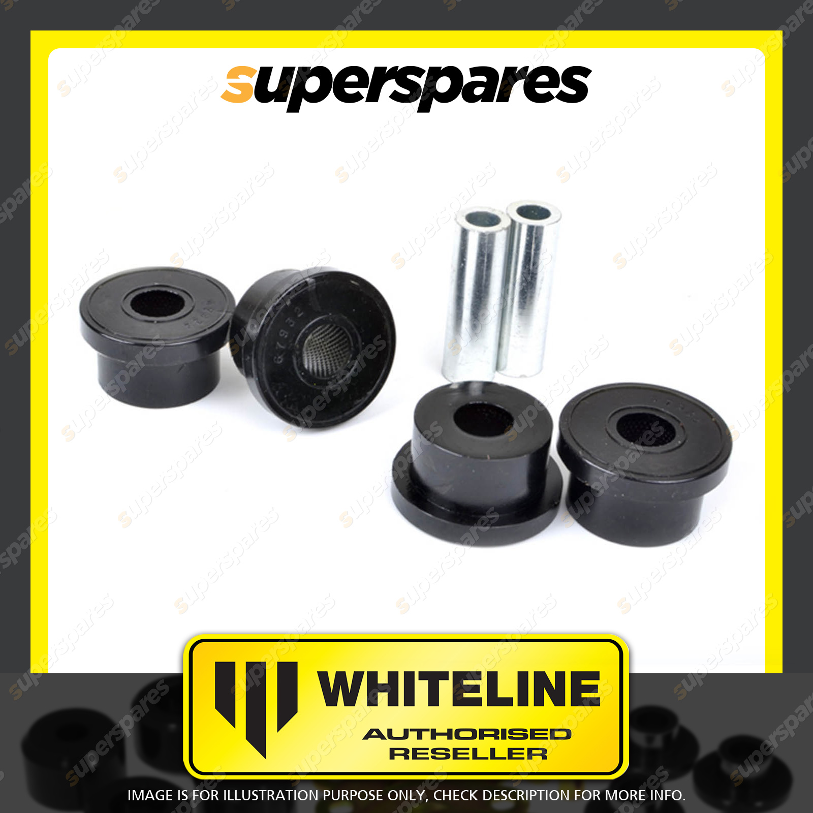 | Contents : Whiteline Front Control arm - lower inner Front bushing Warranty : 3 Year / 60,000Kms Kit Contents : 4 Bushings, 2 Tubes, Grease |