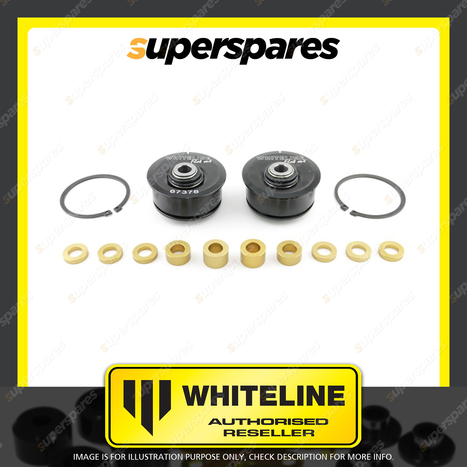 | Contents : Whiteline Front Control arm - lower inner Rear bushing Warranty : 3 Year / 60,000Kms Kit Contents : 2 Alloy Bushings, 10 Spacers, Install Guide | Kit Specifications : Bush Qty : 2 |