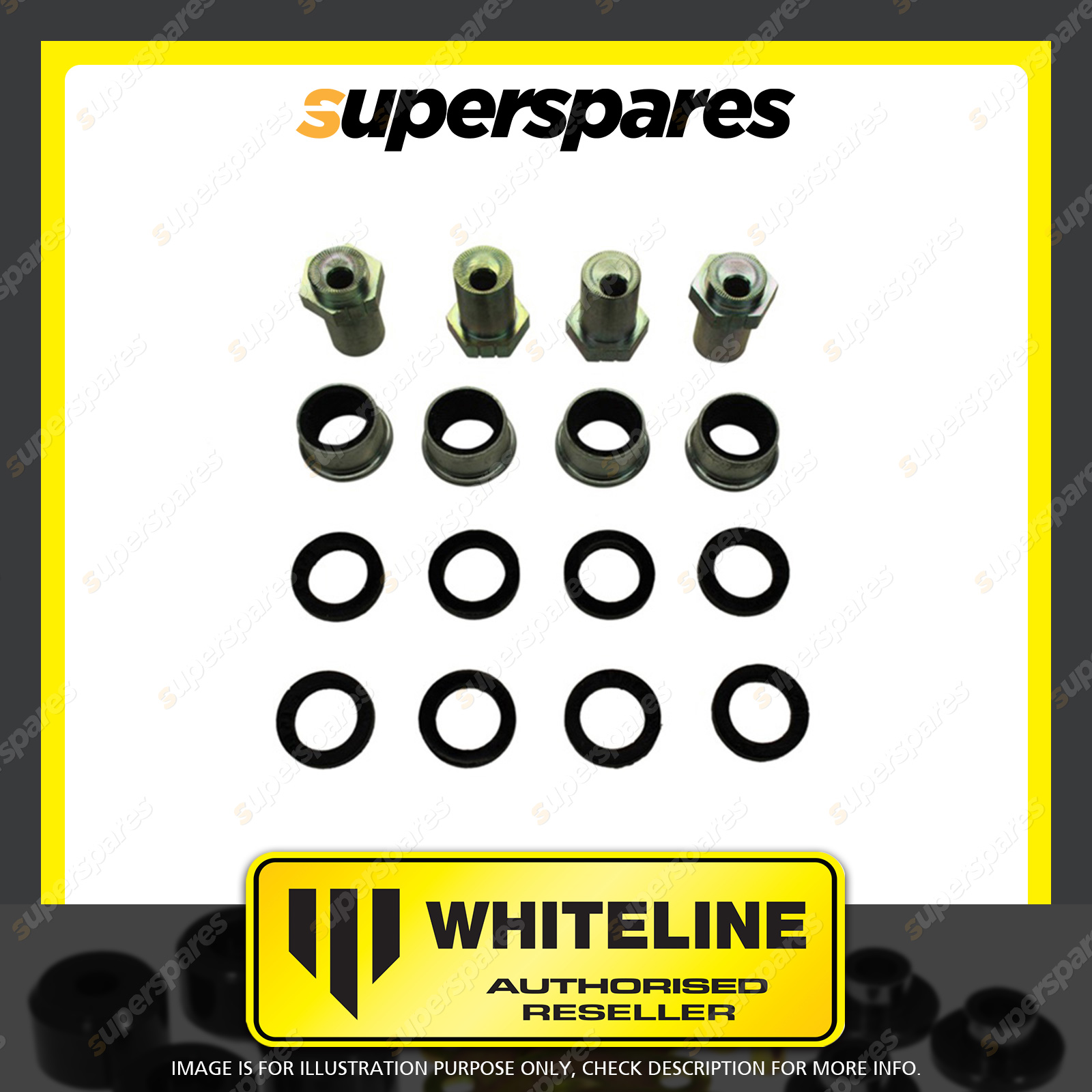 | Contents : Whiteline Front Control arm - upper bushing Warranty : 3 Year / 60,000Kms Kit Contents : 4 Shell Bushings, 8 Bushings, 4 Tubes, Install Guide, Grease | Kit Specifications : OD 1 : 35.5 mm ; OD 2 : 34.2 mm |