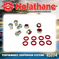 | Contents : Nolathane Front Control arm - upper bushing Warranty : 3 Year / 60,000Kms Kit Contents : 4 Shell Bushings, 8 Bushings, 4 Tubes, Install Guide, Grease |