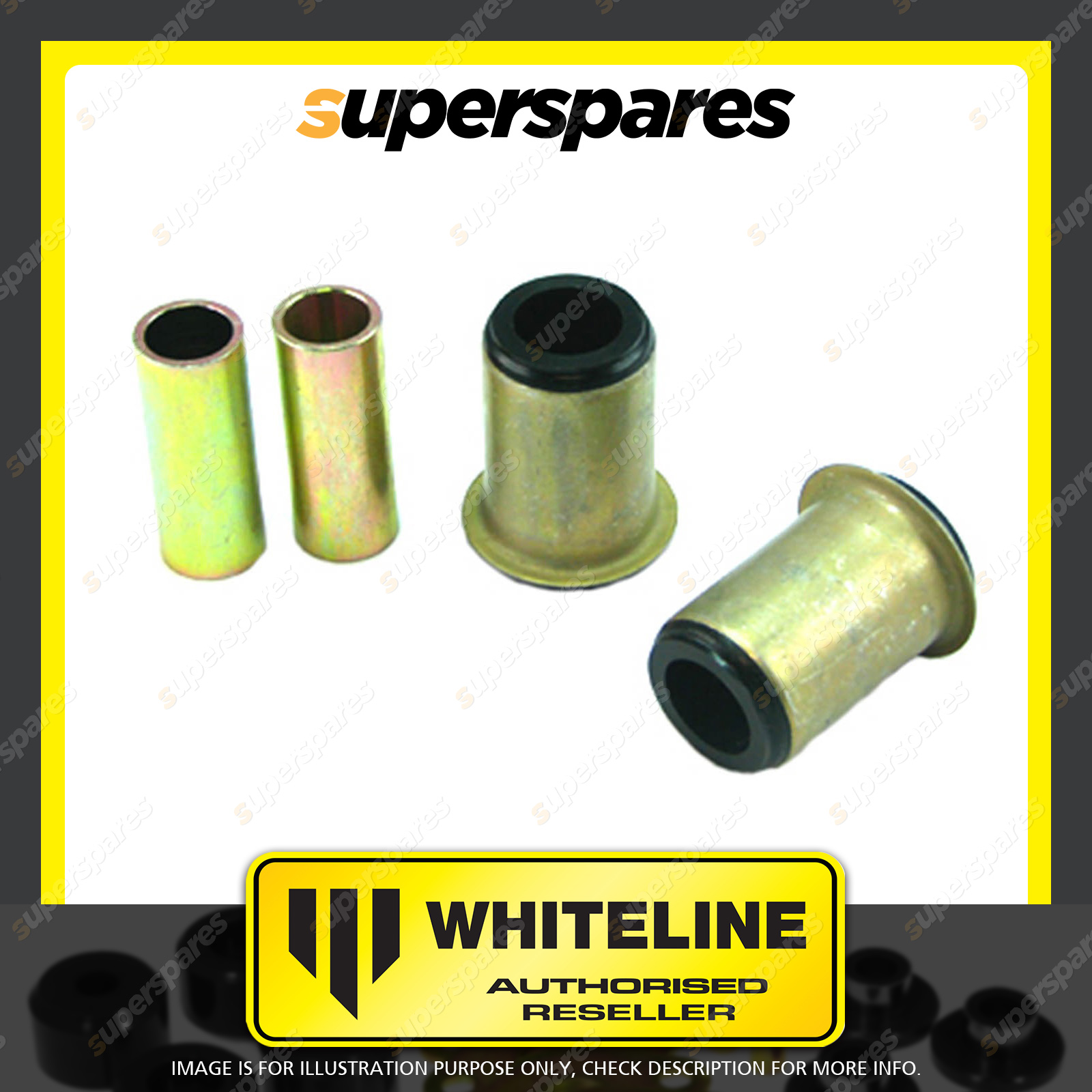 | Contents : Whiteline Front Control arm - upper inner Rear bushing Warranty : 3 Year / 60,000Kms Kit Contents : 2 Shell Bushings, 2 Tubes, Grease |