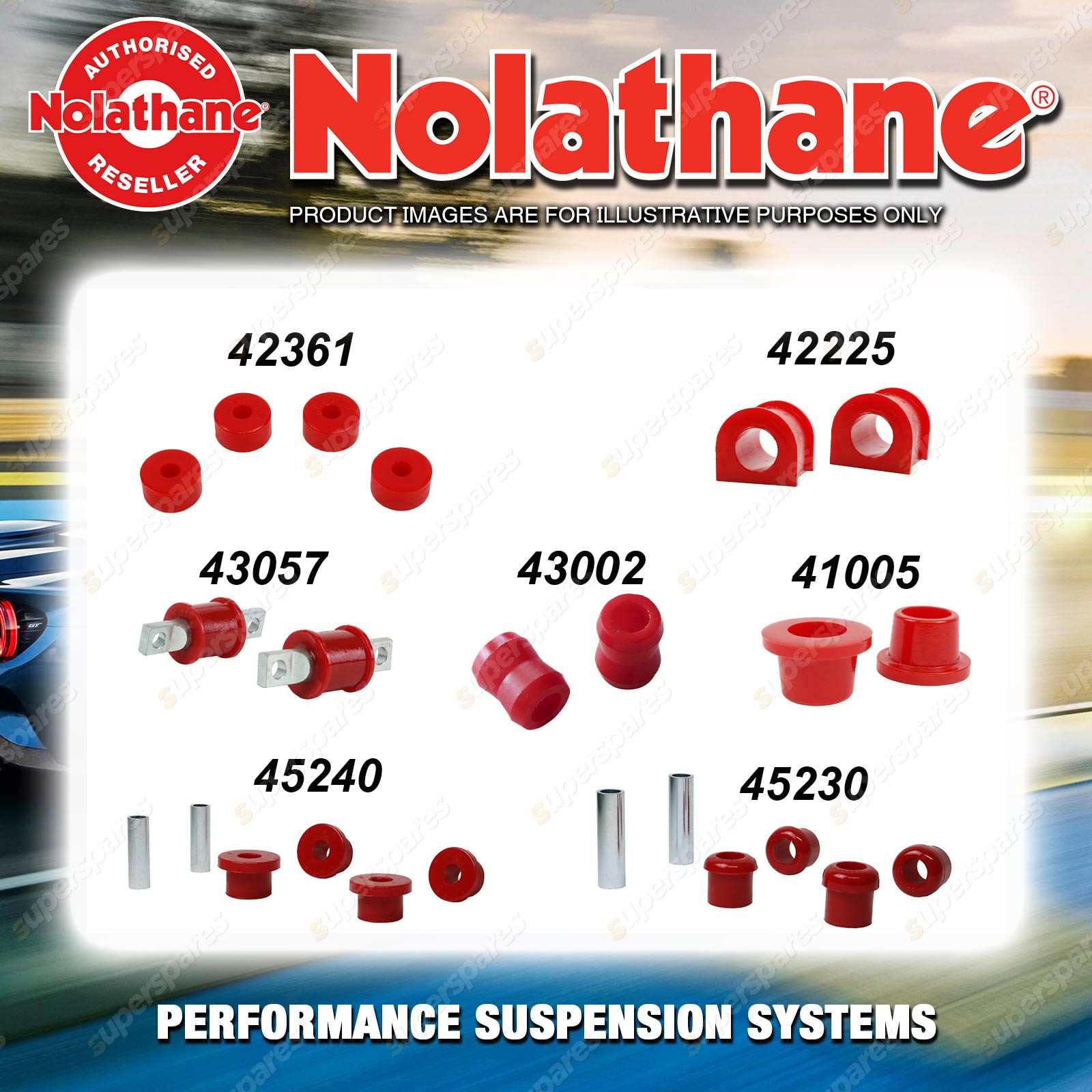 | Nolathane offers a complete range of suspension system.And Nolathane suspension bushing synchronise your suspension system for optimal safety, hangdling and performance .Whether you intend to build a Street Machine, Fast 4, go bush or simply drive to work,suspension bushes are the link between your vehicle and it's springs,struts and shock absorbers.Suspension bushes provide the movement and/or mounting points in your vehicle's suspension system. |