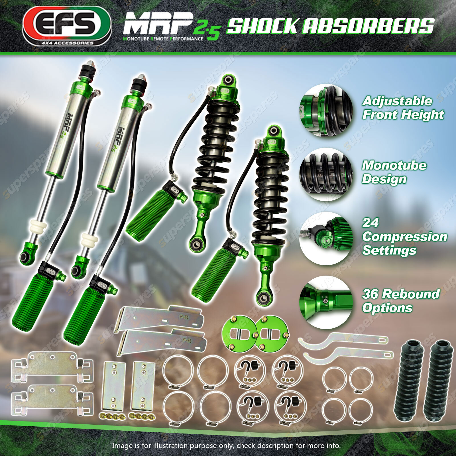 Note: eBay's compatibility table is not accurate in some cases. Please refer to the following information we have provided for you. Copyright © 2014 - 2025 Superspares. All rights reserved. Contents : 4 Pcs Front + Rear EFS MRP 2.5 Shock Absorbers (40mm Lift) Suit Vehicle : Toyota Prado 120 Series 2003+ |