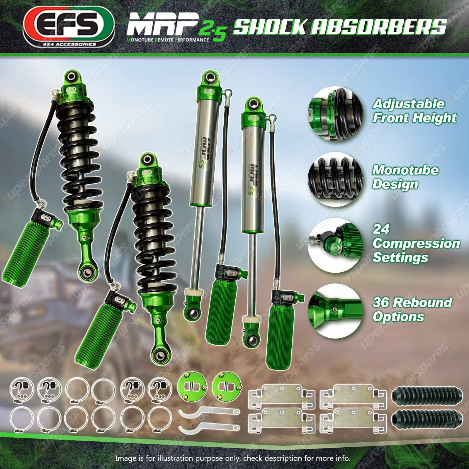 Note: eBay's compatibility table is not accurate in some cases. Please refer to the following information we have provided for you. Copyright © 2014 - 2026 Superspares. All rights reserved. Contents : Front + Rear EFS MRP 2.5 Shock Absorbers (50mm Lift) Suit Vehicle : Mitsubishi Triton 4WD MV 02/2024+ |