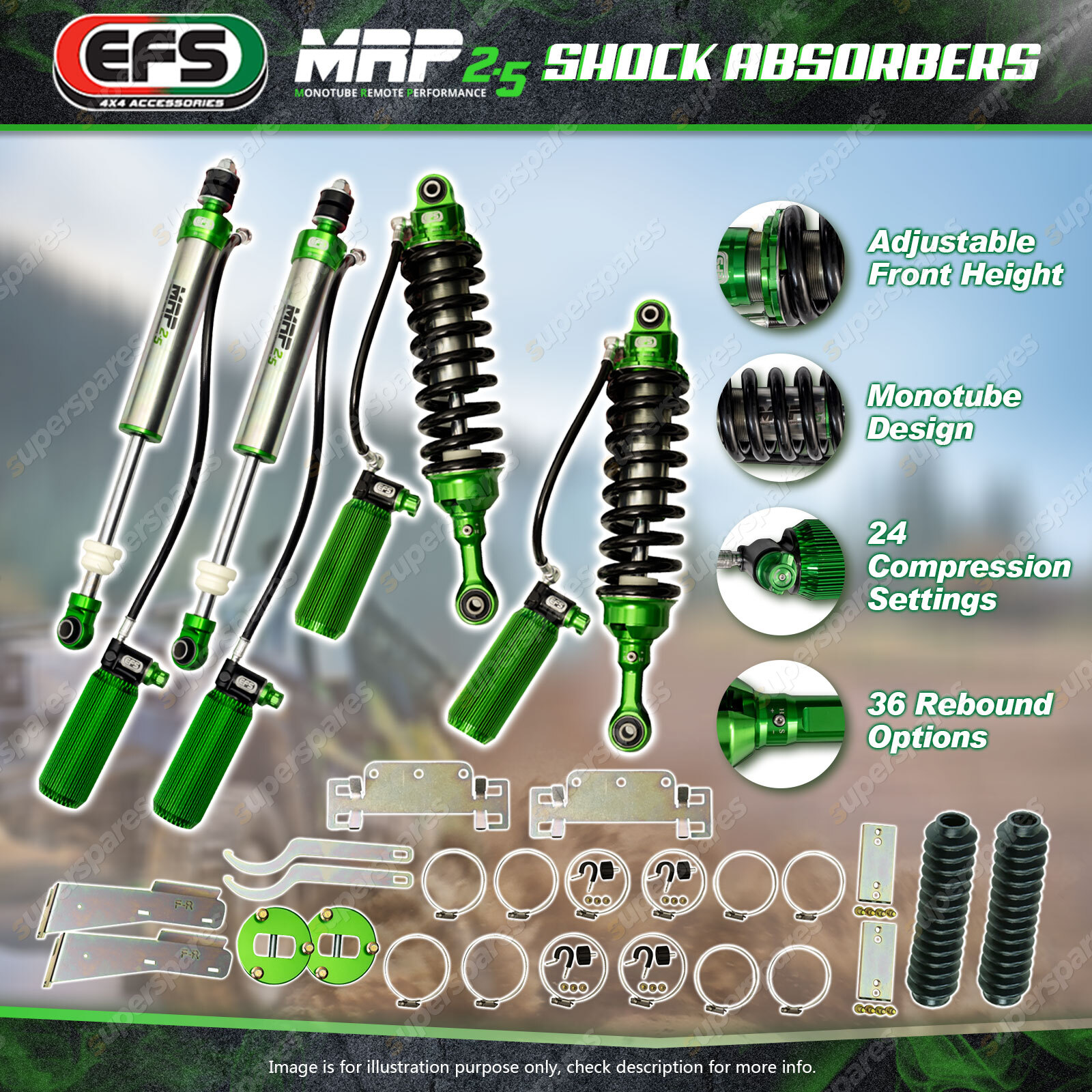 Note: eBay's compatibility table is not accurate in some cases. Please refer to the following information we have provided for you. Copyright © 2014 - 2025 Superspares. All rights reserved. Contents : 4 Pcs Front + Rear EFS MRP 2.5 Shock Absorbers Suit Vehicle : Toyota Landcruiser Prado 150 LWB (NON KDSS & GRANDE) Notes : 24 x Compression - 36 x Rebound Adjustable. 10-1110 Sway Bar Spacer Supplied With MRP Strut Must Be Installed. |