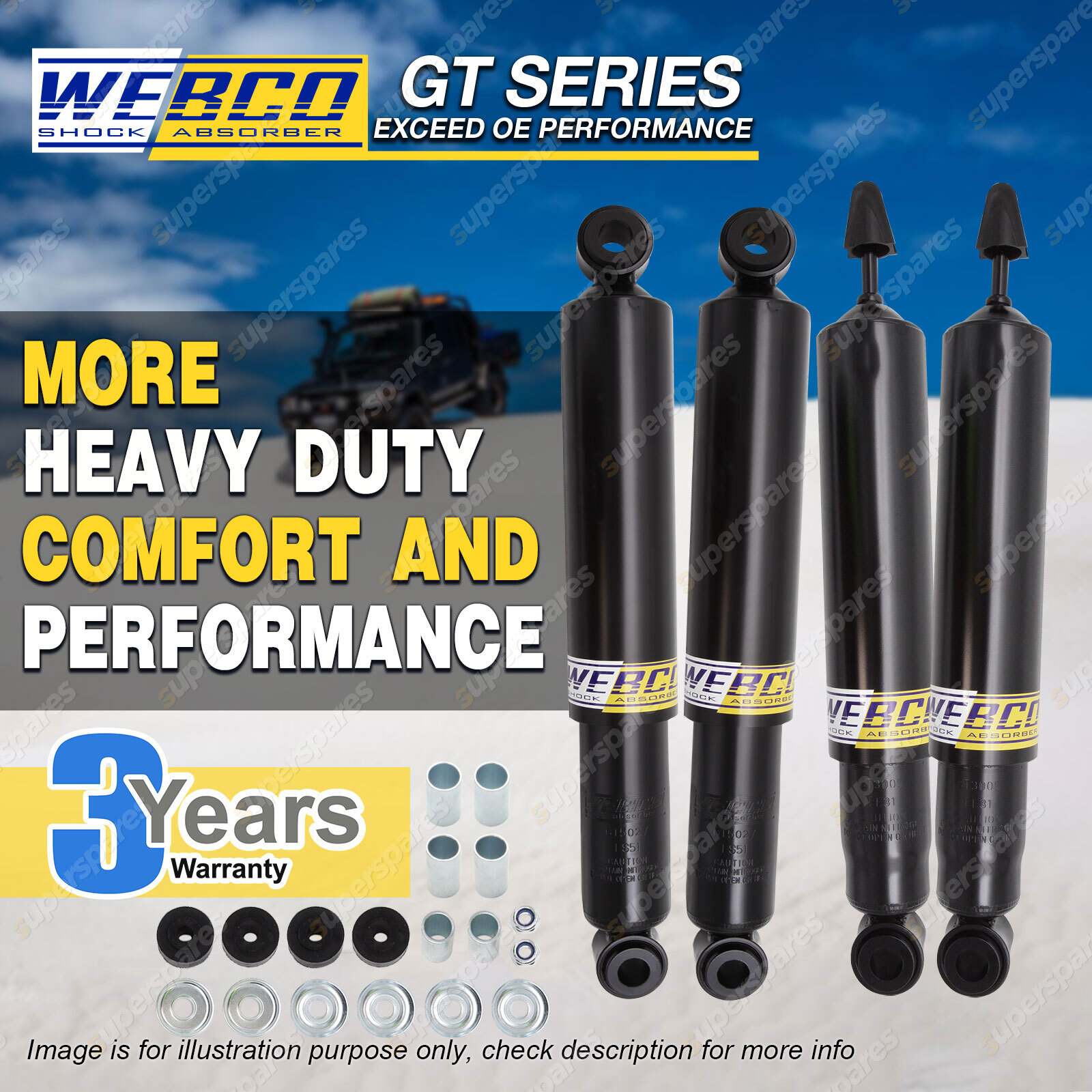 CONTENTS: 2 Pcs Front Webco Heavy Duty Shock Absorbers 2 Pcs Rear Webco Extra Raised Heavy Duty Shock Absorbers SUITS: TOYOTA LANDCRUISER FJ60 FJ62 HJ60 HJ61 all models (rear shock bush 19mm) Steering Dampener - SD7002(27H702) or SD7006(27H706) T/A 3 Oct-85 - 90 (*please advise year model, so we can make sure send you the right parts) |