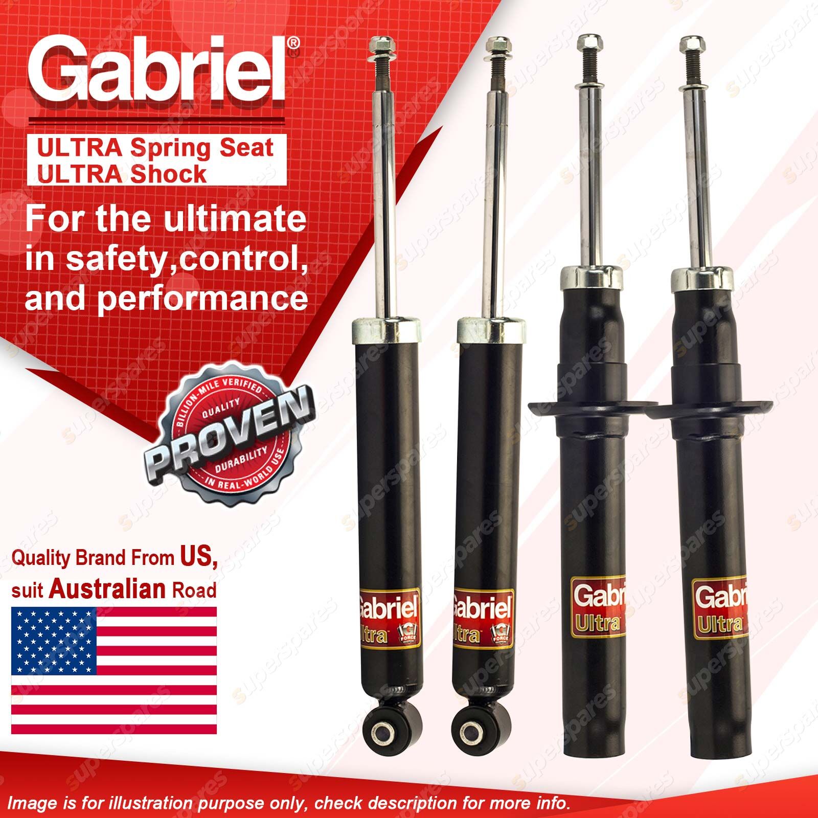 | Note: eBay's compatibility table is not accurate in some cases. Please refer to the following information we have provided for you. Copyright © 2014 - 2025 Superspares. All rights reserved. Contents : 2 x Gabriel Front Ultra Spring Seat Shock Absorbers - Gas 2 x Gabriel Rear Ultra Shock Absorbers - Gas Warranty : 3 Years Suit : Volvo XC60 Wagon D4, D5, T5, T6, AWD 10/17-On |
