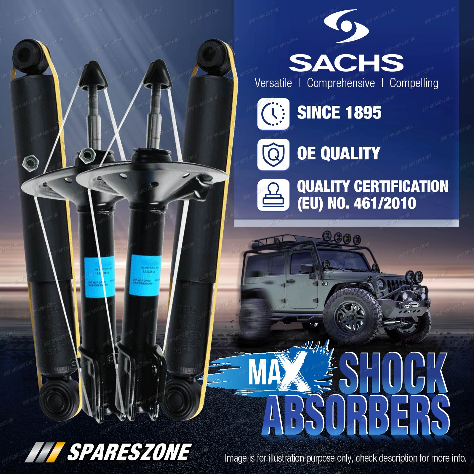Take Adventure, Freedom, And Strength To The Max. SACHS MAX shock absorbers are designed to give you greater comfort and safety over conventional shock absorbers. Specially designed for 4x4s, SACHS MAX supports vehicles with up to a 2-inch lift, superior handling characteristics and maximum safety in extreme conditions and under heavy loads. |