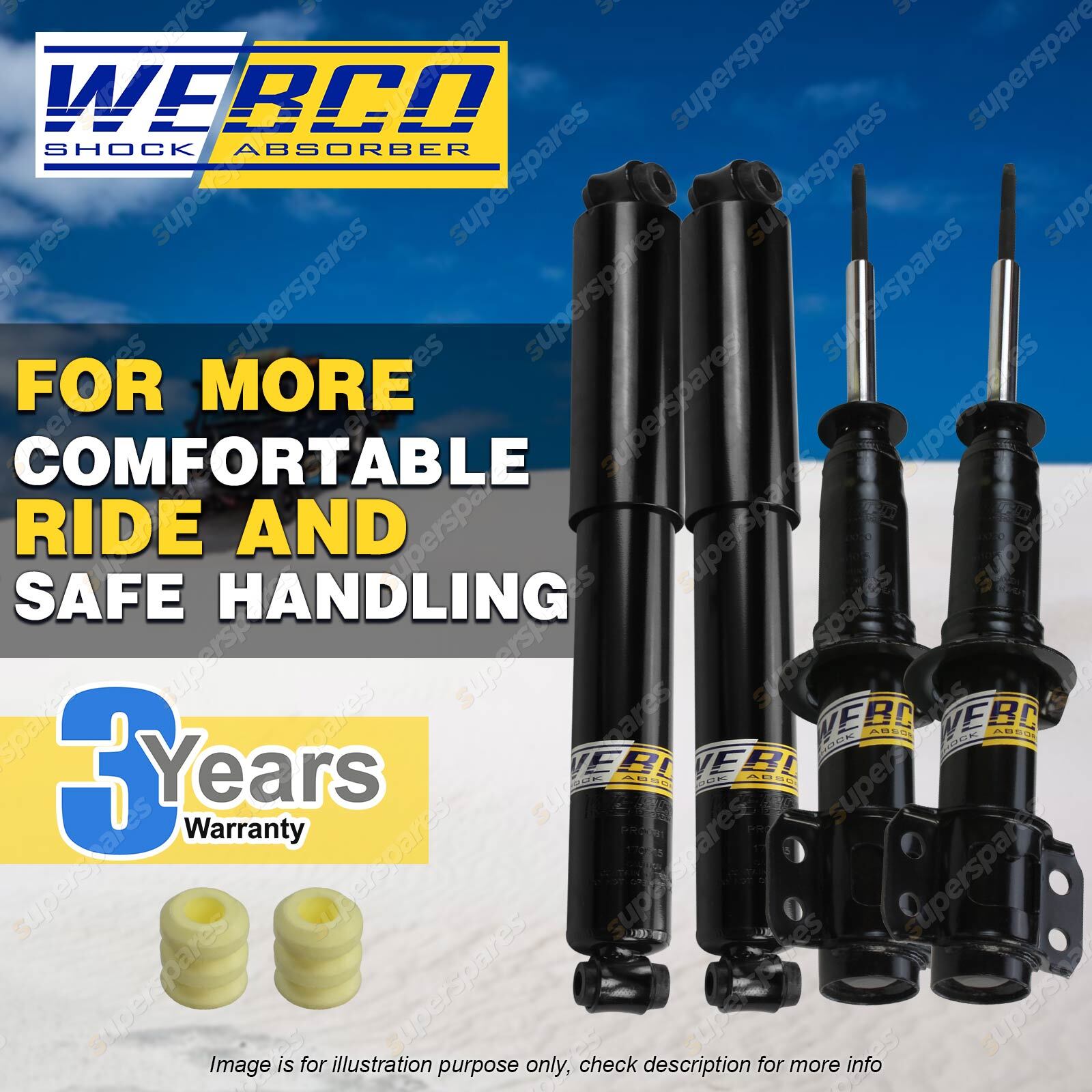 CONTENTS: 2 Pcs Front Webco Spring Seat Strut Shock Absorbers 2 Pcs Rear Webco Shock Absorbers SUITS: FORD TRANSIT All models Ute & Van Jan-91 - Jan-01 (*please advise year model, so we can make sure send you the right parts) |