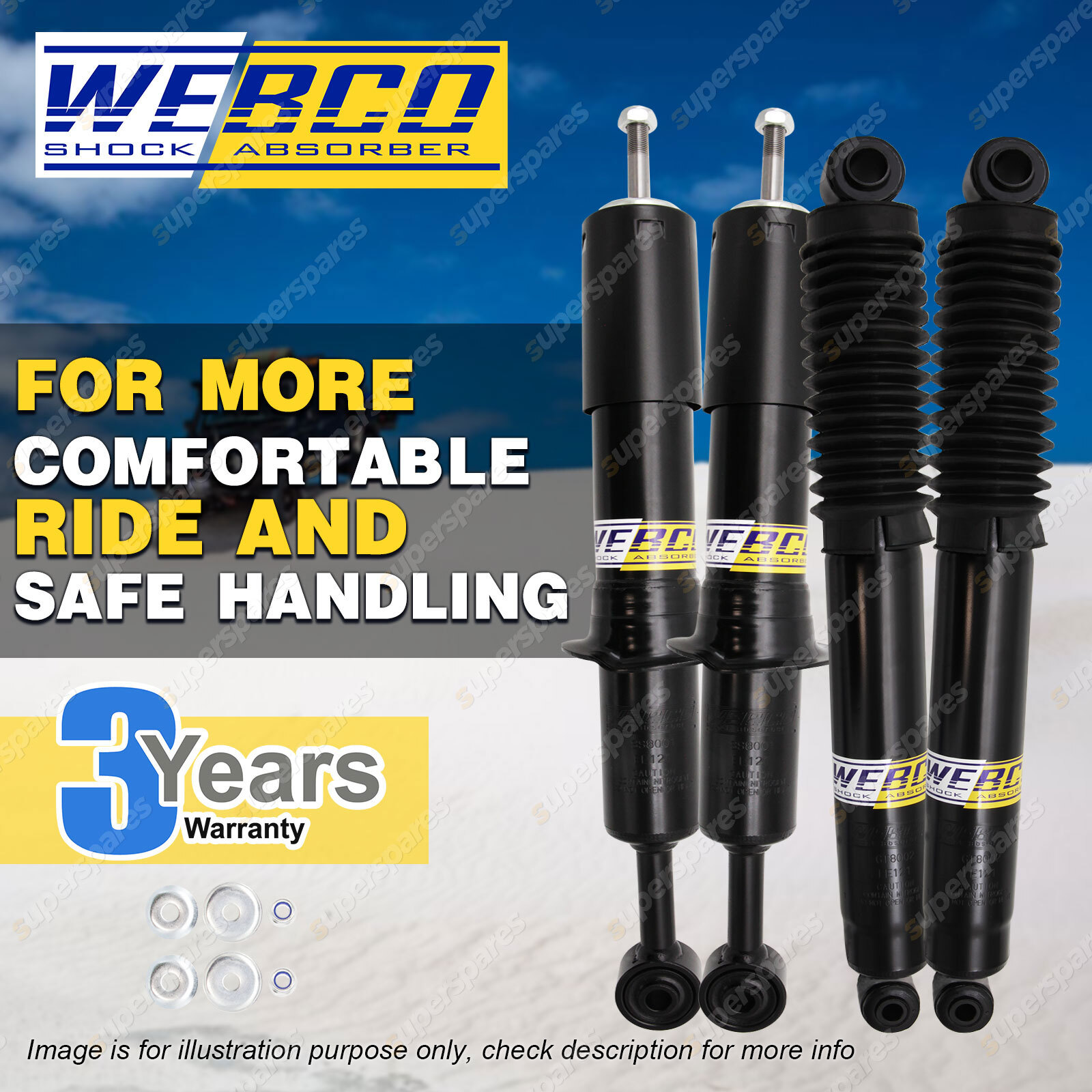 CONTENTS: 2 Pcs Front Webco Spring Seat Strut Shock Absorbers 2 Pcs Rear Webco Heavy Duty Shock Absorbers SUITS: GWM Great Wall Cannon 2020-on (*please advise year model, so we can make sure send you the right parts) |