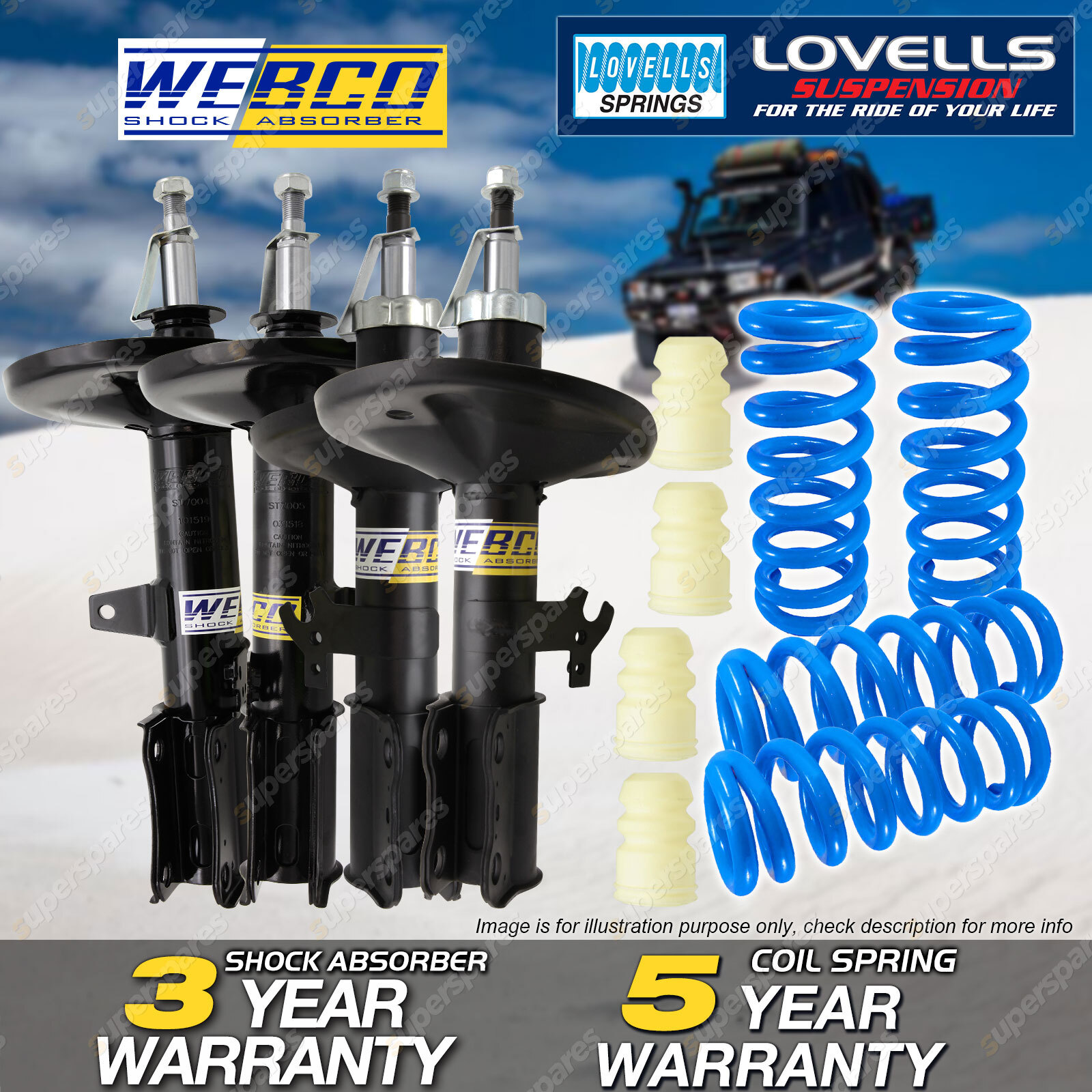 CONTENTS: 2 Pcs Front Webco Strut Shock Absorbers 2 Pcs Front STD Lovells Coil Springs (Standard) 2 Pcs Rear Webco Strut Shock Absorbers 2 Pcs Rear STD Lovells Coil Springs (Standard) SUITS: Holden Apollo JM,JP Sedan 4 Cyl 2.2 3/93-8/97 |