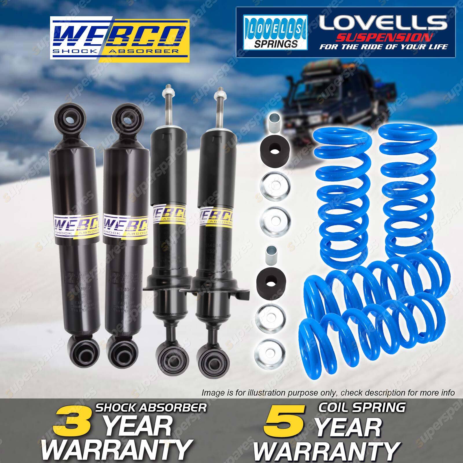 CONTENTS: 2 Pcs Front Webco Spring Seat Shock Absorbers 2 Pcs Front Raised Lovells Coil Springs (40-50mm Raised) 2 Pcs Rear Webco Heavy Duty Shock Absorbers 2 Pcs Rear Raised Lovells Coil Springs (40-50mm Raised) SUITS: Nissan Pathfinder 6 Cyl P R51 Wagon 7/05 on |