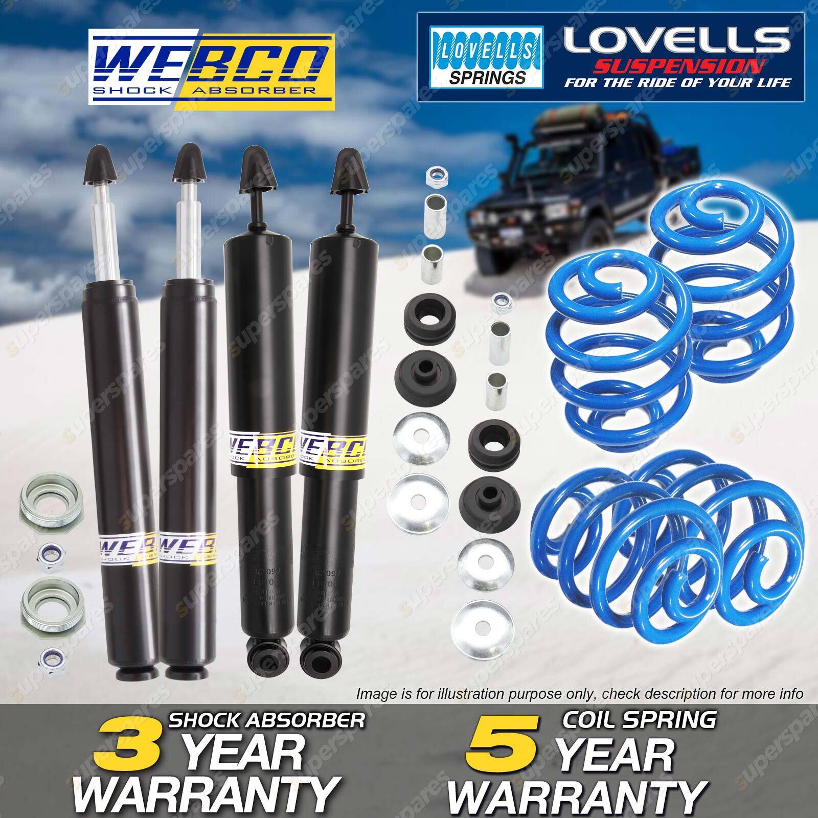 CONTENTS: 2 Pcs Front Webco Cartridge Shock Absorbers 2 Pcs Front Sport Low Lovells Coil Springs (25-40mm Lower) 2 Pcs Rear Webco Cartridge Shock Absorbers 2 Pcs Rear Sport Low Lovells Coil Springs (25-40mm Lower) SUITS: Holden Commodore VK Wagon 8 Cyl All 3/84-3/86 Holden Commodore VL Wagon 6 Cyl 8 Cyl All 3/86-8/88 |