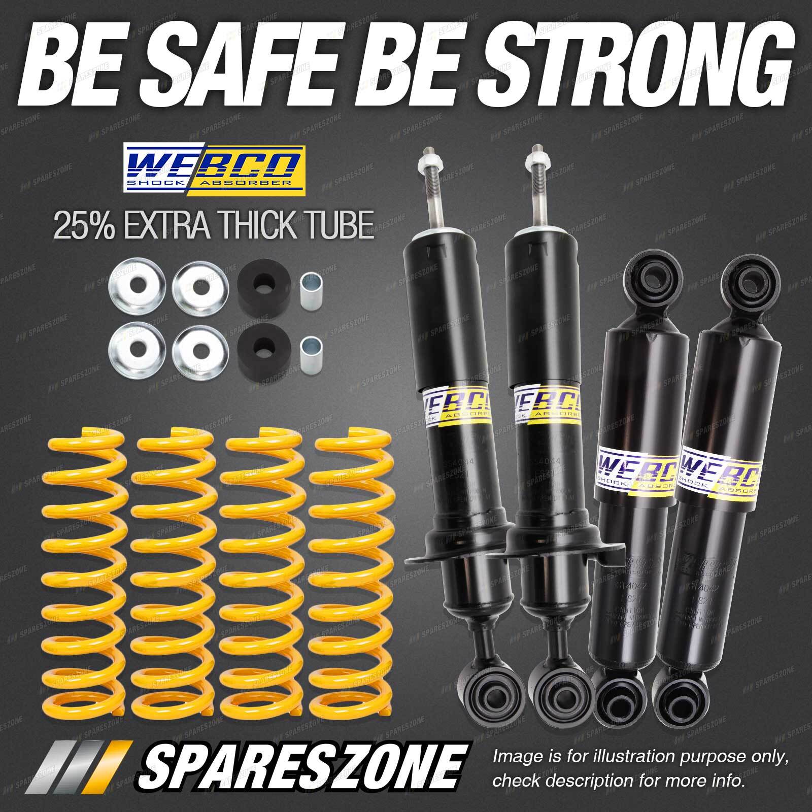 2 Pcs Front Webco Spring Seat Shock Absorbers 2 Pcs Rear Webco Heavy Duty Shock Absorbers 2 Pcs Front STD King Coil Springs (Standard Height) 2 Pcs Rear STD King Coil Springs (Standard Height) |