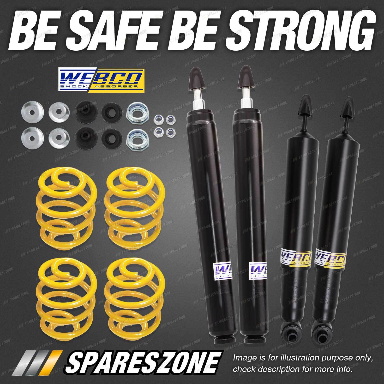 2 Pcs Front Webco Cartridge Shock Absorbers 2 Pcs Rear Webco Heavy Duty Shock Absorbers 2 Pcs Front Super Low King Coil Springs (40-50mm Lowered) 2 Pcs Rear Super Low King Coil Springs (40-50mm Lowered) |