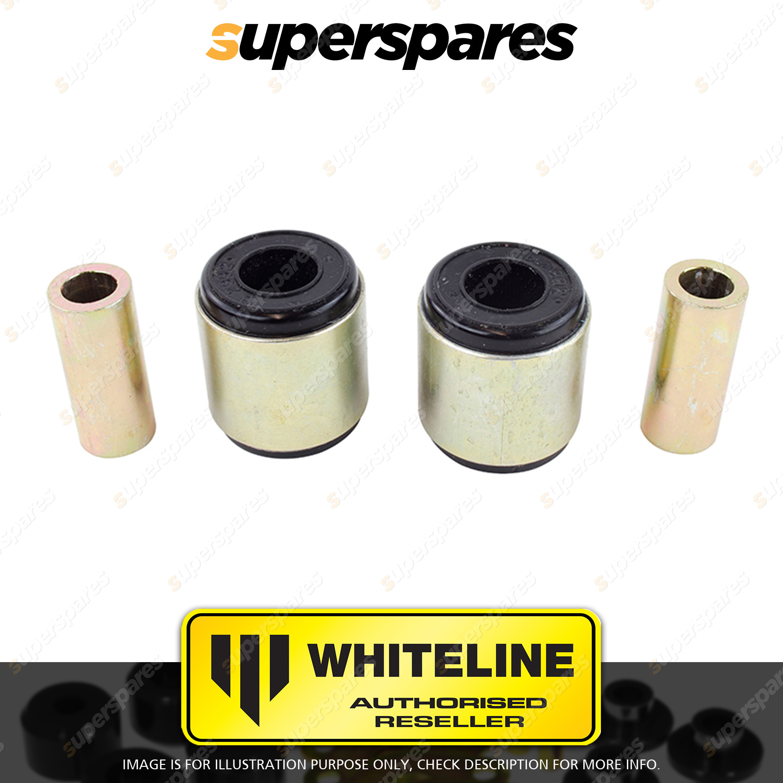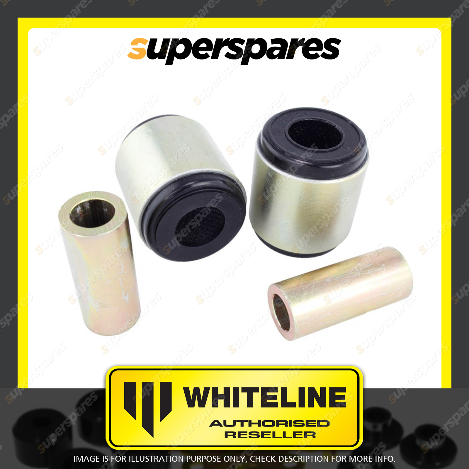 | Contents : Whiteline Front Shock absorber - to control arm bushing Warranty : 3 Year / 60,000Kms Kit Contents : 2 Shell Bushings, 2 Tubes, Grease |
