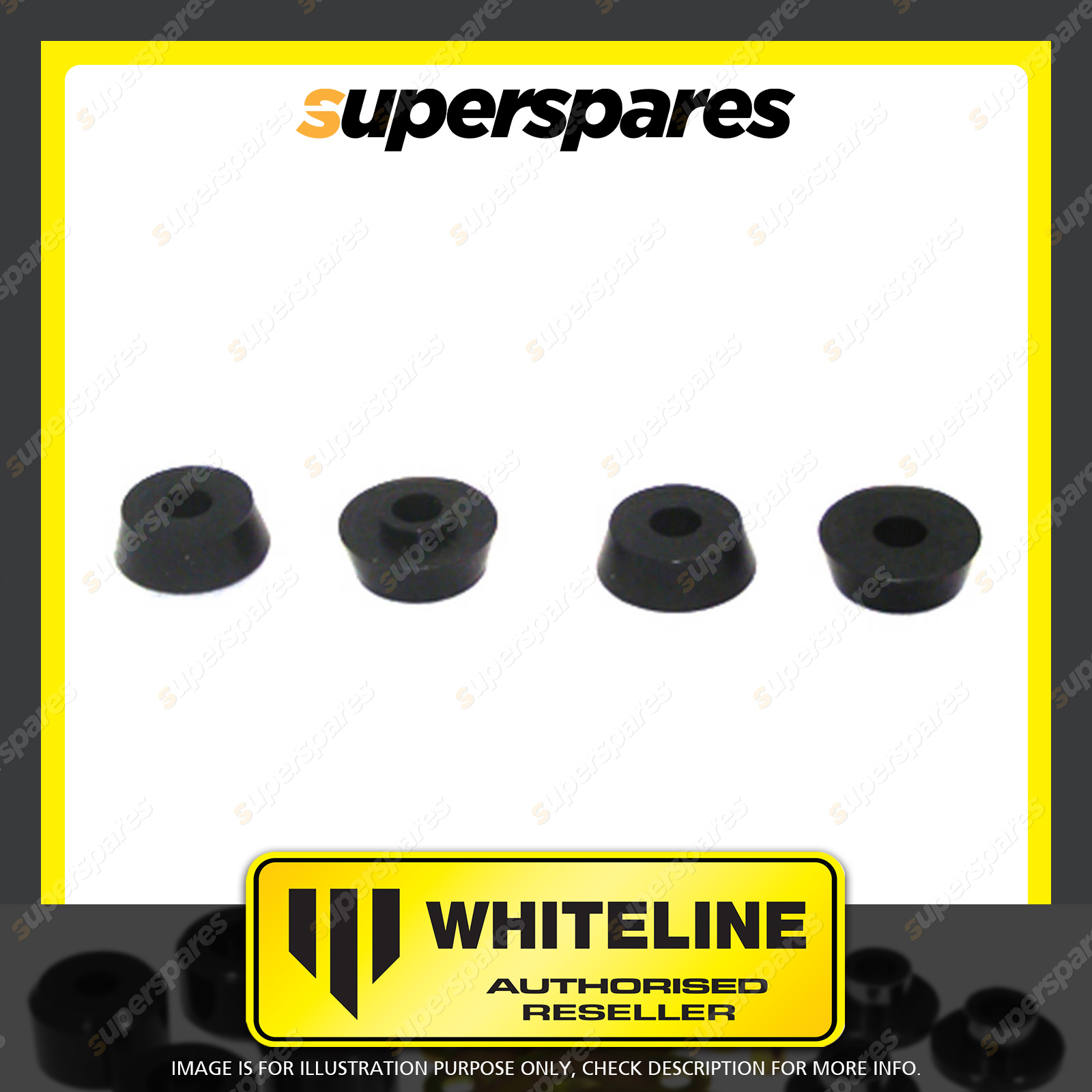 | Contents : Whiteline Front Shock absorber - upper bushing Warranty : 3 Year / 60,000Kms Kit Contents : 4 Bushings, Install Guide |