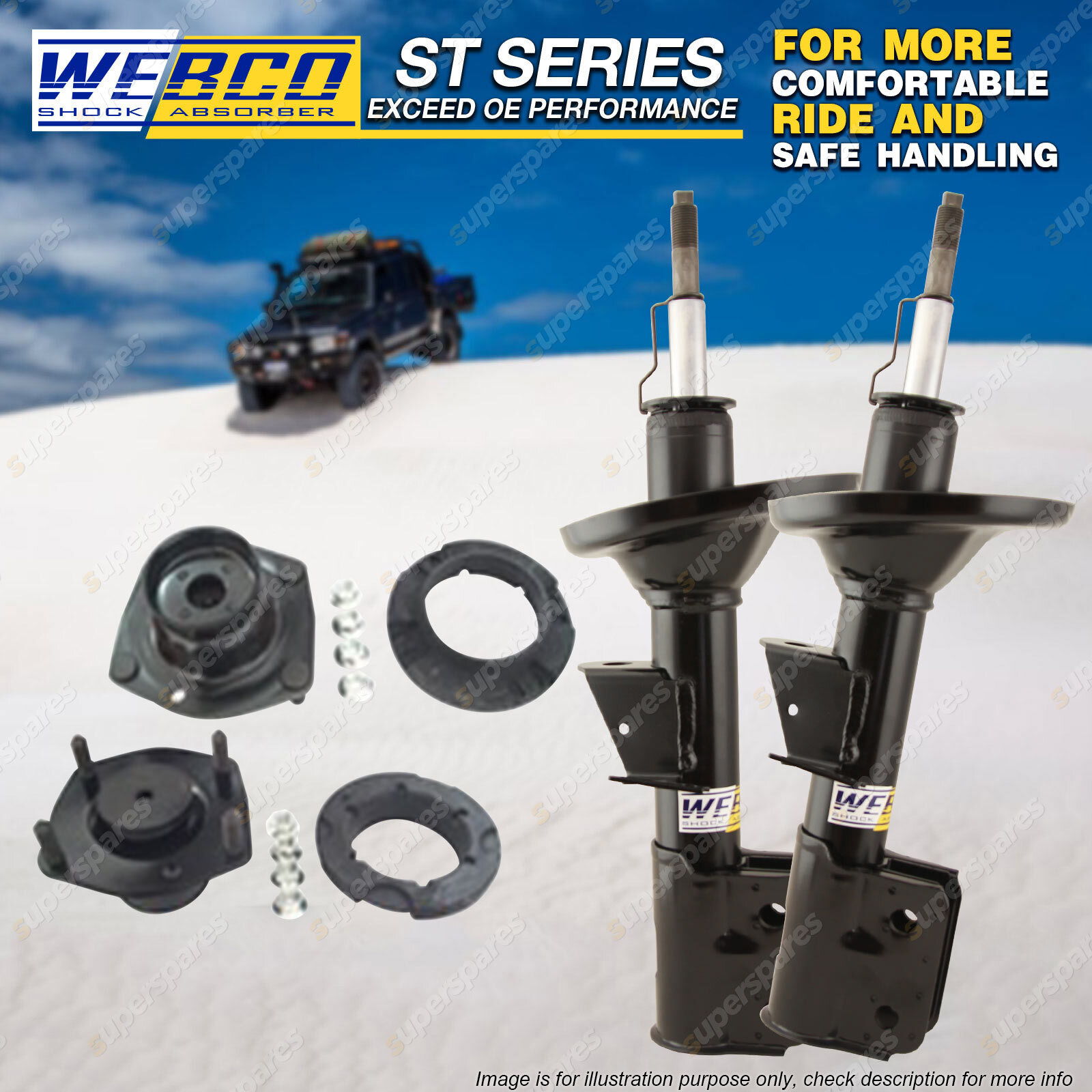 | CONTENTS: 2 Pcs Front Webco Strut Shock Absorbers;2 Front LH / RH Strut Mounts SUITS: JEEP GRAND CHEROKEE WH 4WD Wagon Jun-05 - on (*please advise year model, so we can make sure send you the right parts) |