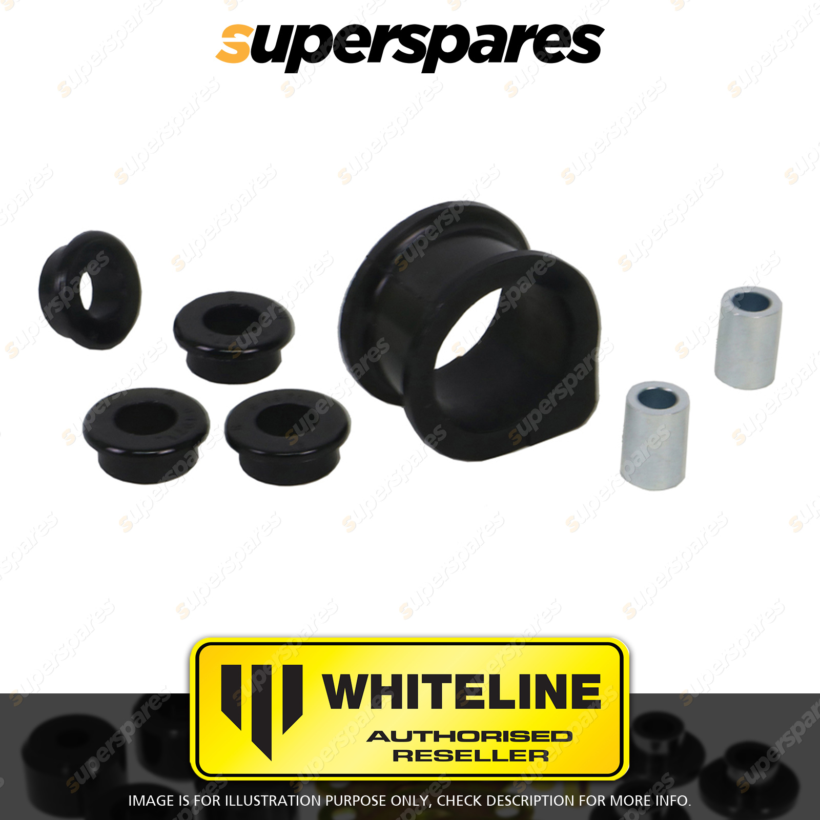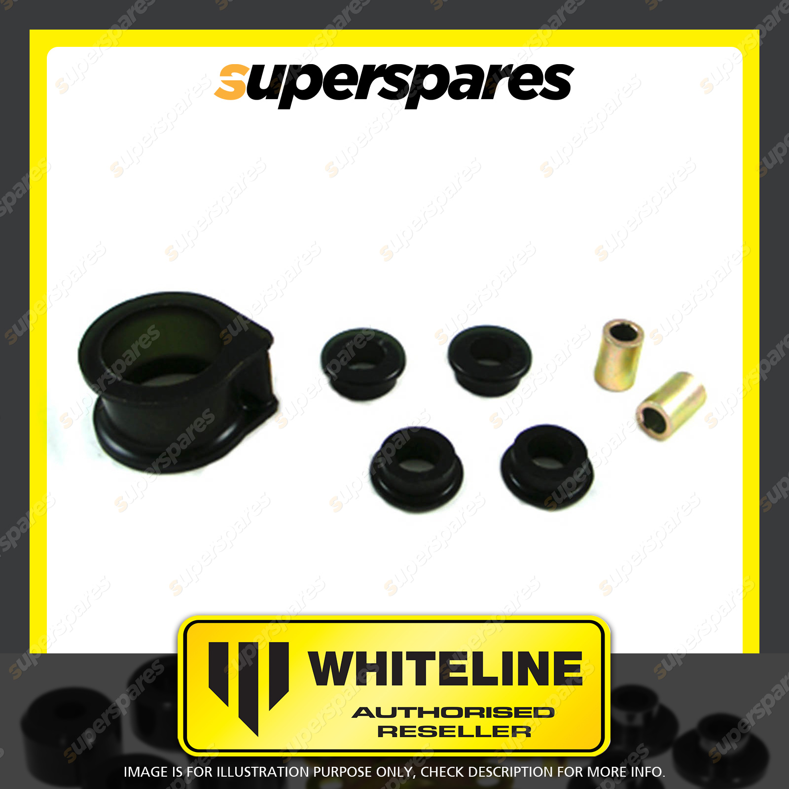 | Contents : Whiteline Front Steering - rack and pinion mount bushing Warranty : 3 Year / 60,000Kms Kit Contents : 5 Bushings, 2 Tubes, Grease |