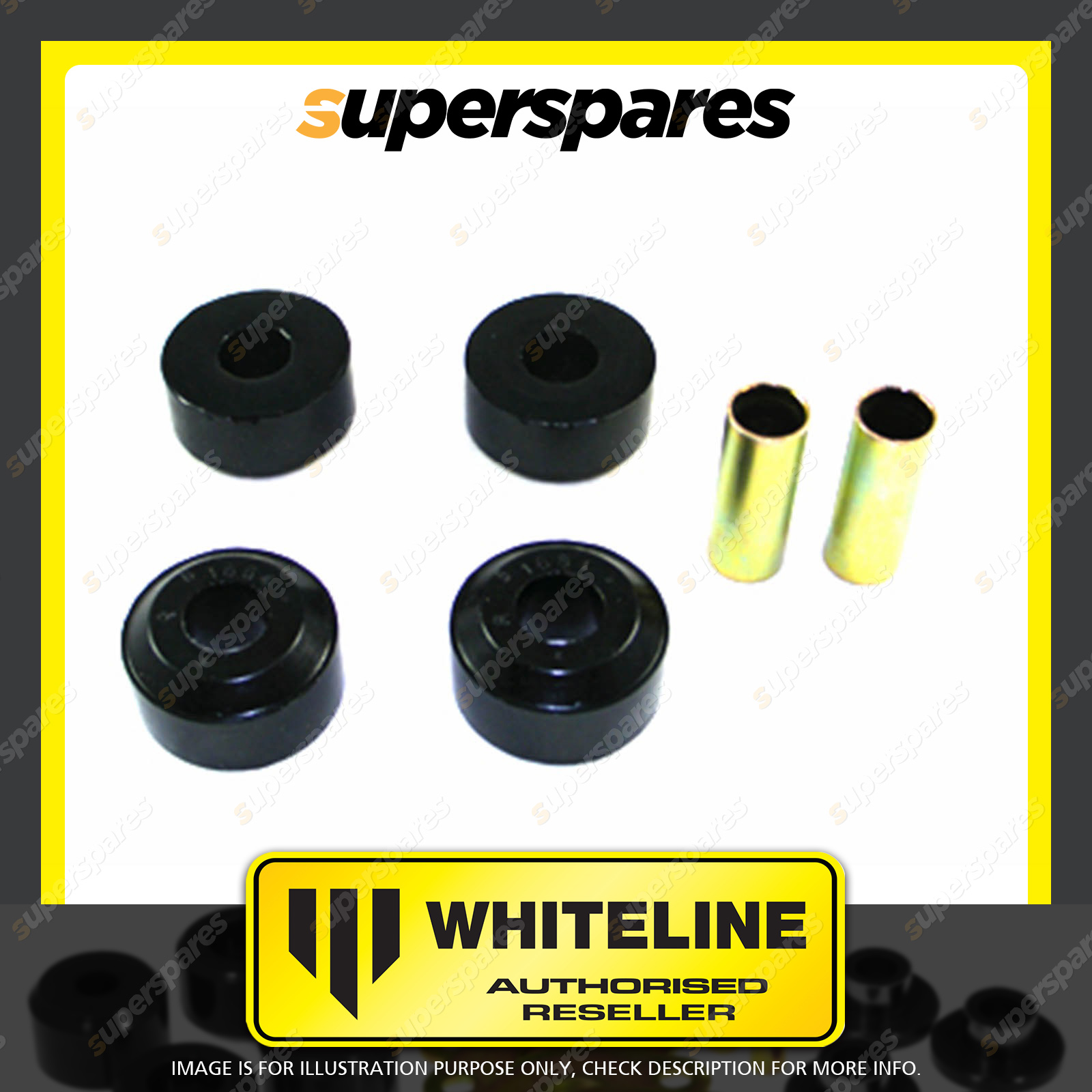 | Contents : Whiteline Front Strut rod - to chassis bushing Warranty : 3 Year / 60,000Kms Kit Contents : 4 Bushings, 2 Tubes, Grease |