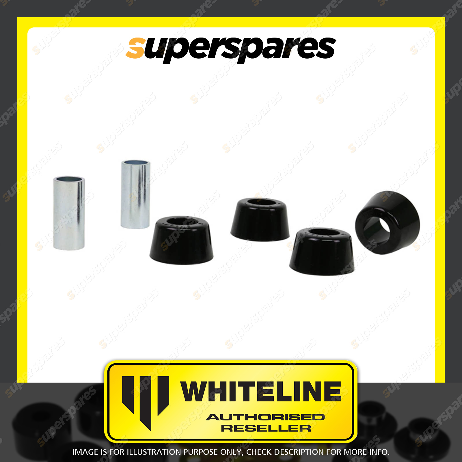 | Contents : Whiteline Front Strut rod - to chassis bushing Warranty : 3 Year / 60,000Kms Kit Contents : 4 Bushings, 2 Tubes, Grease |