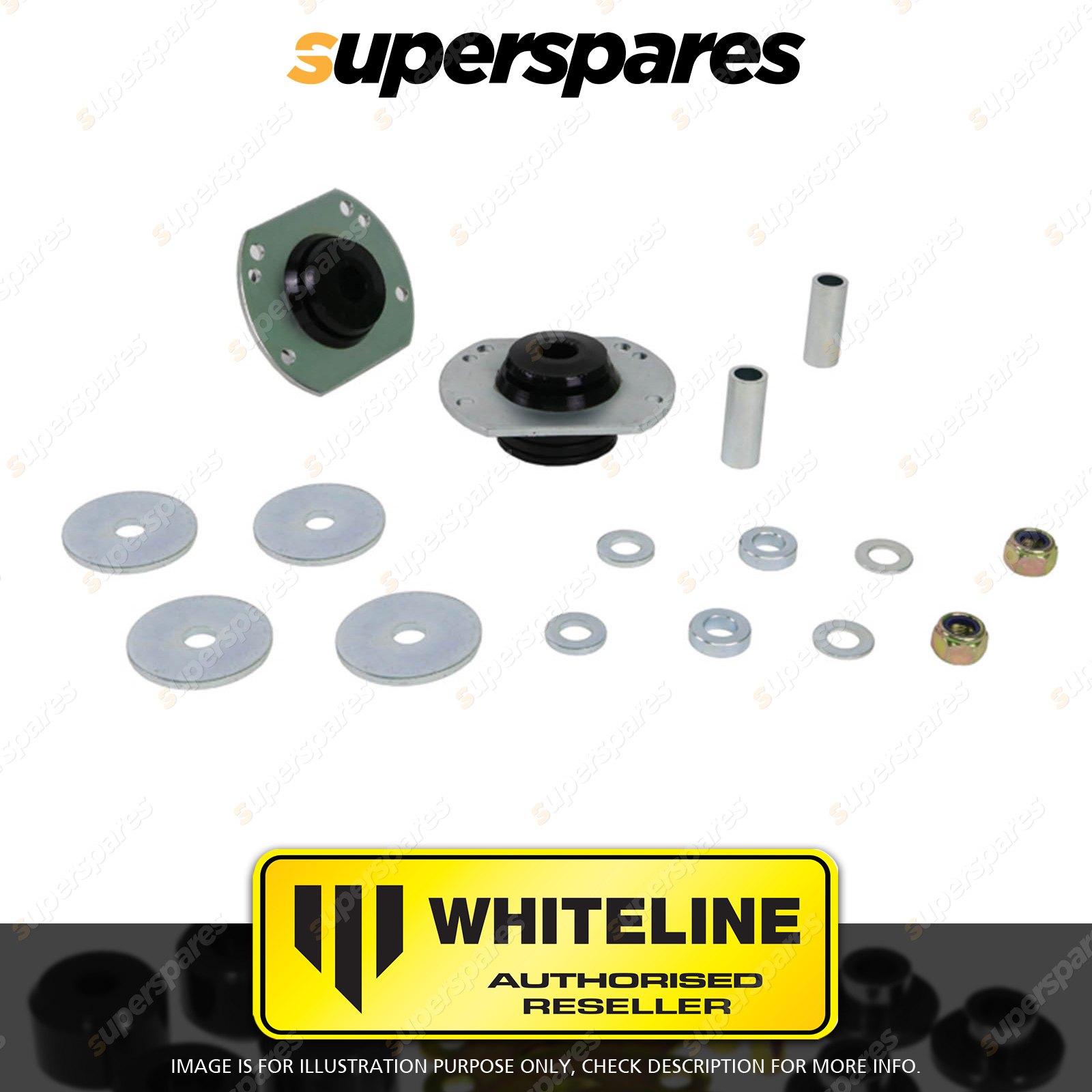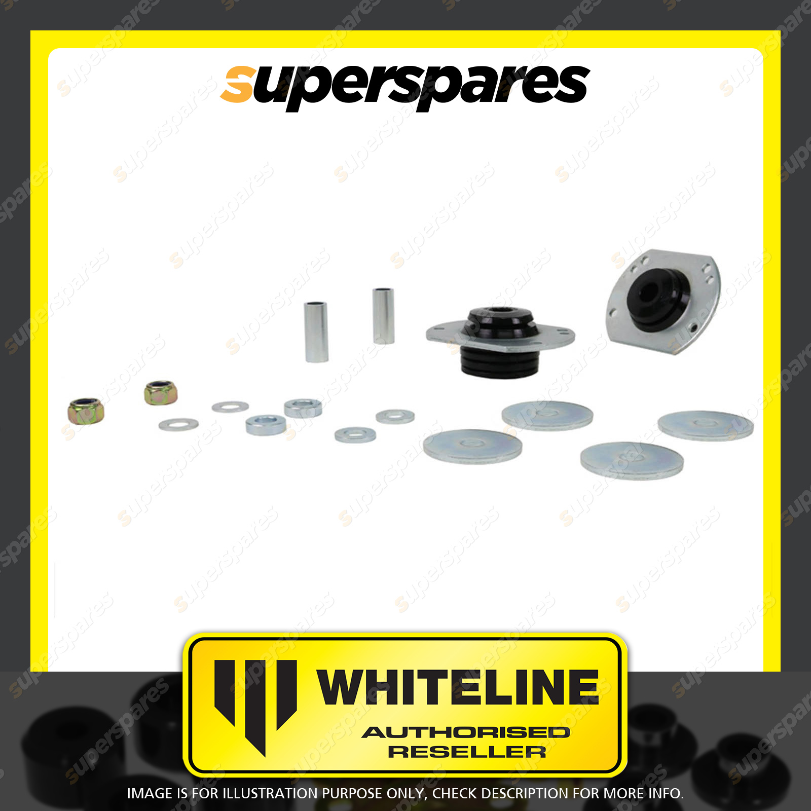 | Contents : Whiteline Front Strut rod - to chassis bushing Warranty : 3 Year / 60,000Kms Kit Contents : 2 Bushings, 2 Tubes, 6 Spacers, 2 Washers, 2 Nuts, Install Guide, Grease | Kit Specifications : Bush Qty : 2 |