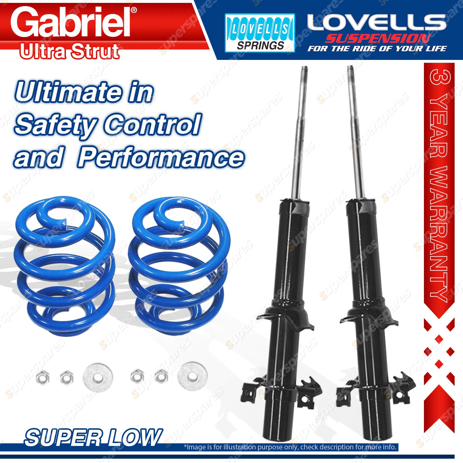 Contents: 2 x Gabriel Ultra Strut Shock Absorbers - Gas 2 x Super Low Lovells Springs Suit: Honda Integra DA9 1.8L Coupe 6/89-93 |