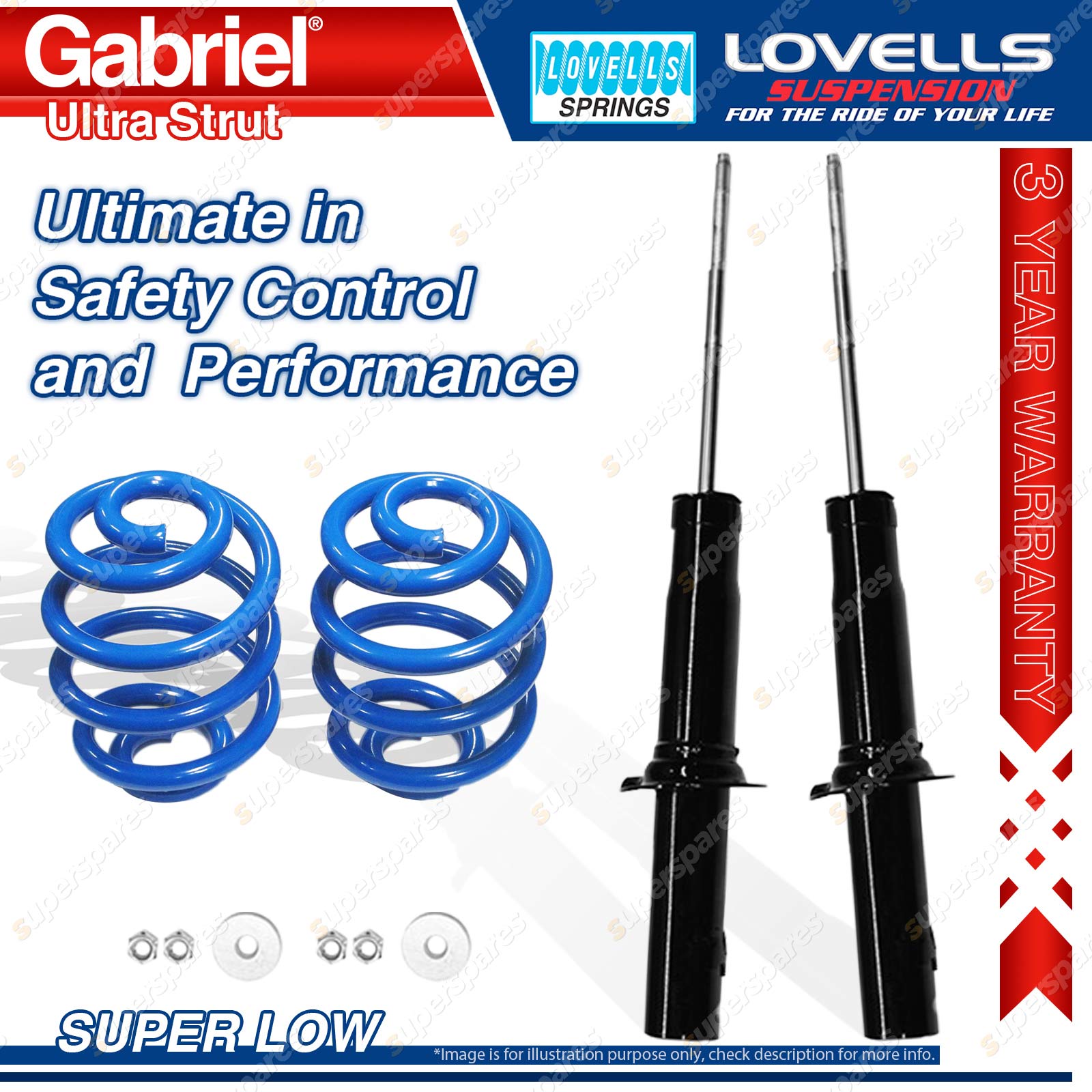 Contents: 2 x Gabriel Ultra Strut Shock Absorbers - Gas 2 x Super Low Lovells Springs Suit: Honda Civic EJ Sedan, Hatch, Coupe 10/95-00 |