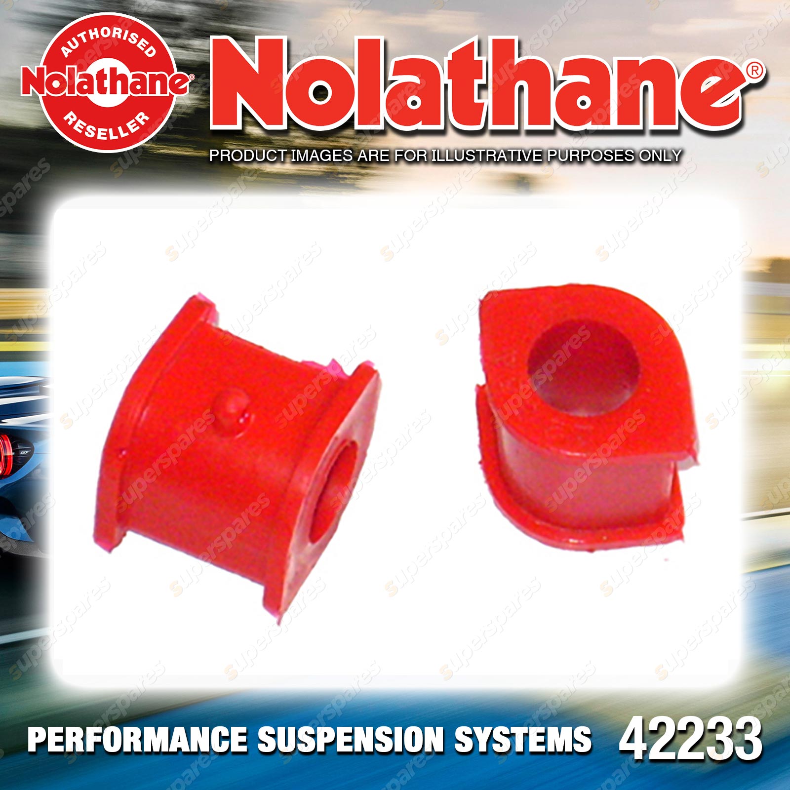 | Contents : Nolathane Front Sway bar - mount bushing Warranty : 3 Year / 60,000Kms Kit Contents : 2 Bushings, Grease |