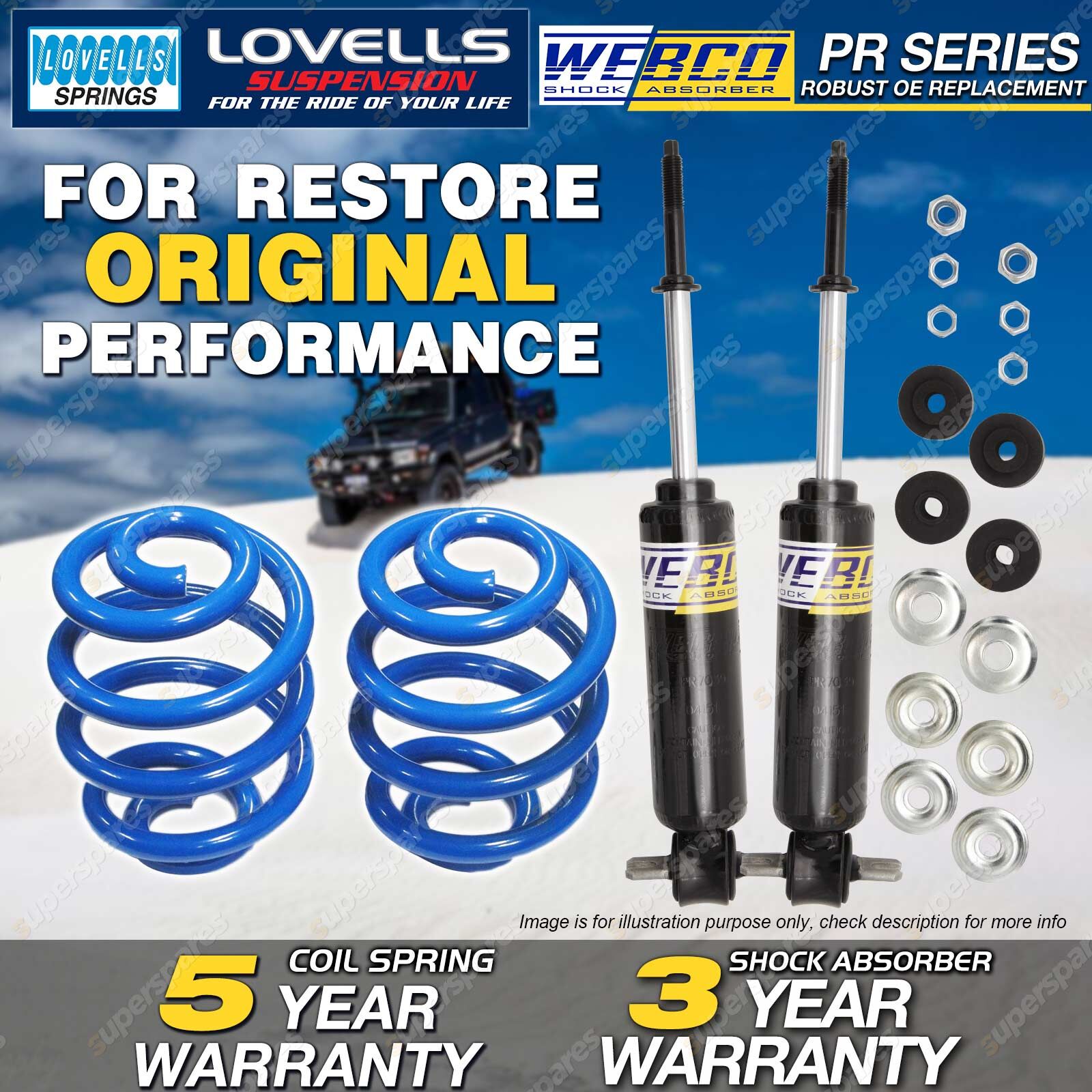 CONTENTS: 2 Pcs Front Webco Premium Shock Absorbers 2 Pcs Front Super Low Lovells Coil Springs (45-65mm Lower) SUITS: Toyota Hilux 2WD LN30 LN40 RN30 RN40 Ute 78-81 |