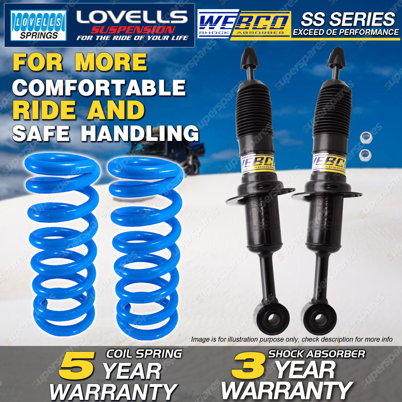 CONTENTS: 2 Pcs Front Webco Spring Seat Shock Absorbers 2 Pcs Front HD Raised Lovells Coil Springs( 40-50mm Raised ) SUITS: FORD RANGER PX Pick Up 2.5ltr 3.0ltr 4WD Nov-11 - 2018 (*please advise year model, so we can make sure send you the right parts) |
