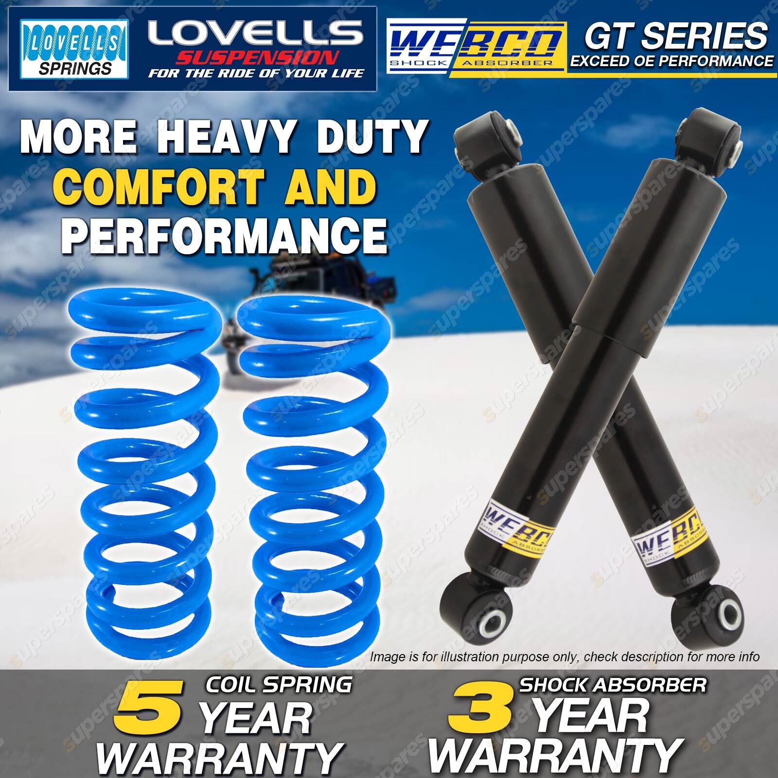 CONTENTS: 2 Pcs Front Webco Heavy Duty Shock Absorbers 2 Pcs Front Lovells Standard Coil Springs SUITS: LAND ROVER Discovery 3/99-02 All TG Wagon (Ser II) (*please advise year model, so we can make sure send you the right parts) |