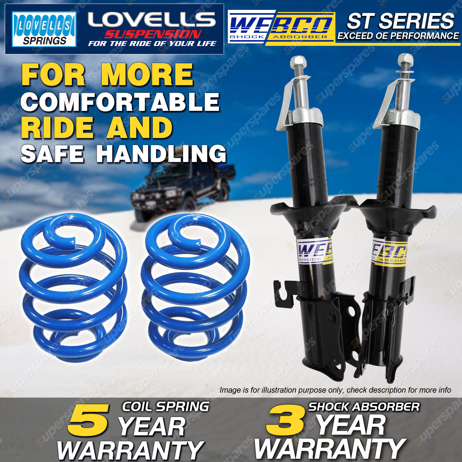 CONTENTS: 2 Pcs Front Webco Strut Shock Absorbers 2 Pcs Front Super Low Lovells Coil Springs( 45-65mm Lower ) SUITS: FORD FESTIVA WB WD WF Hatchback (excl. WB WD with ABS) Jan-94 - Apr-01 (*please advise year model, so we can make sure send you the right parts) |