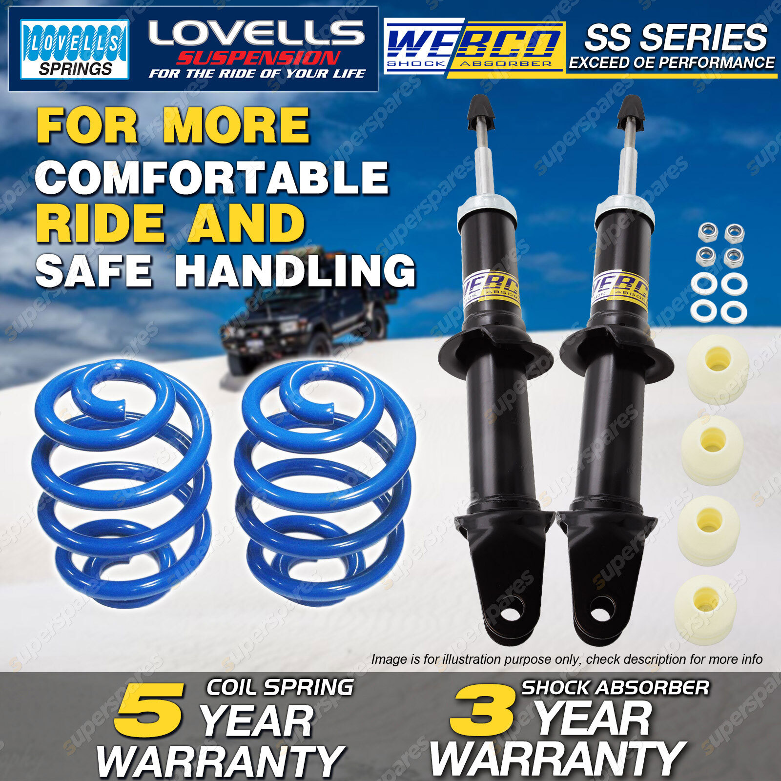 CONTENTS: 2 Pcs Front Webco Spring Seat Shock Absorbers 2 Pcs Front Lovells Super Low Coil Springs( 45-65mm Lower ) SUITS: FORD Falcon BA, BF (Series I) Sedan 8 Cyl 9/02-7/07 FORD Falcon BA, BF (Series I) Wagon 8 Cyl 9/02-7/07 (*please advise year model, so we can make sure send you the right parts) |
