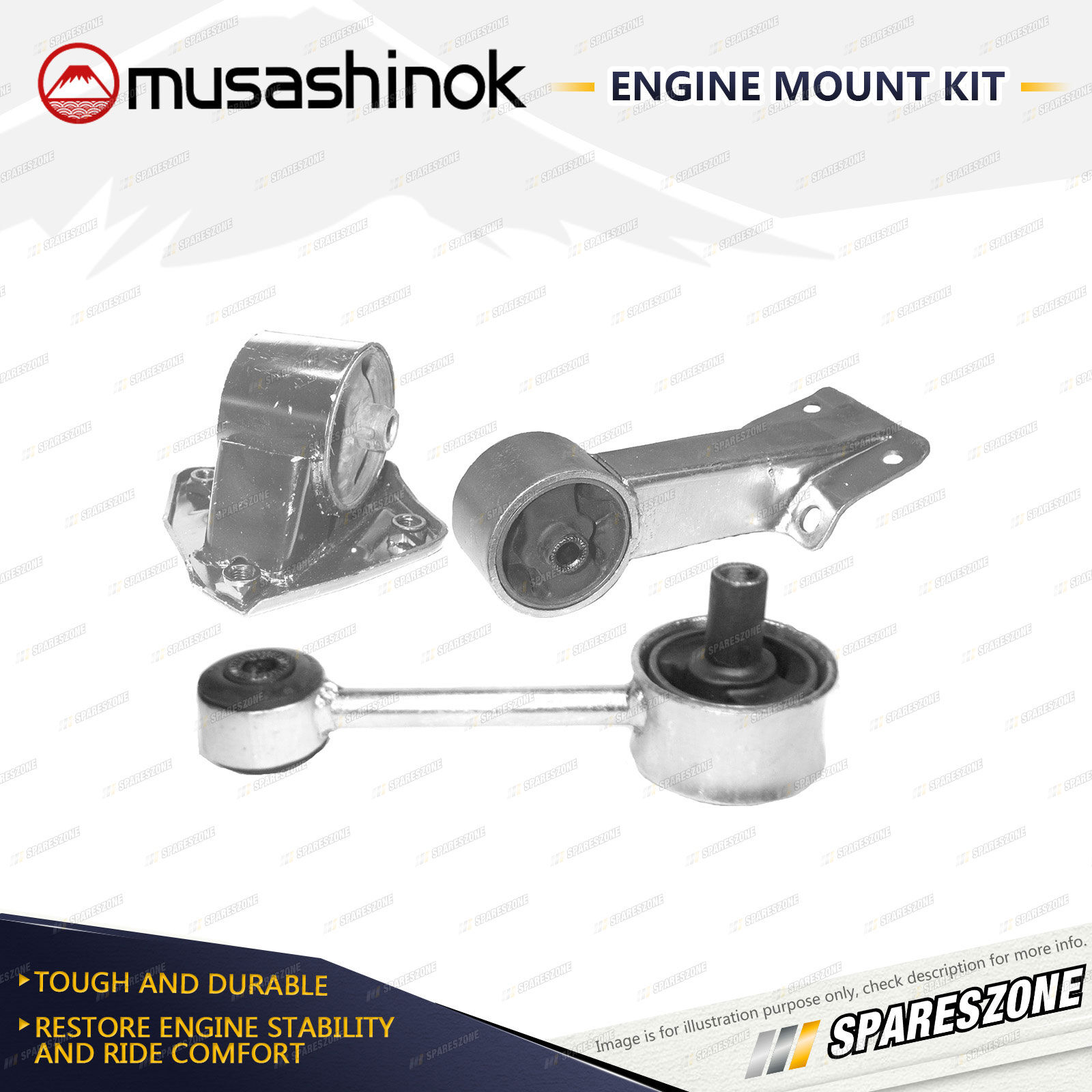 ![]() | About Engine Mounts : Musashinok engine mounts are manufactured to OE standard and very high quality, which is vital given the additional pressure on today's engine mounts.The Musashinok Engine Mount range sets new standards for quality whether manufactured in rubber or urethane.Musashinok's unique urethane design provides rubber-like smoothness and combined with urethanes durability, gives an added advantage over similar products manufactured with rubber. This makes them an ideal product for use in taxis and other commercial fleets. |