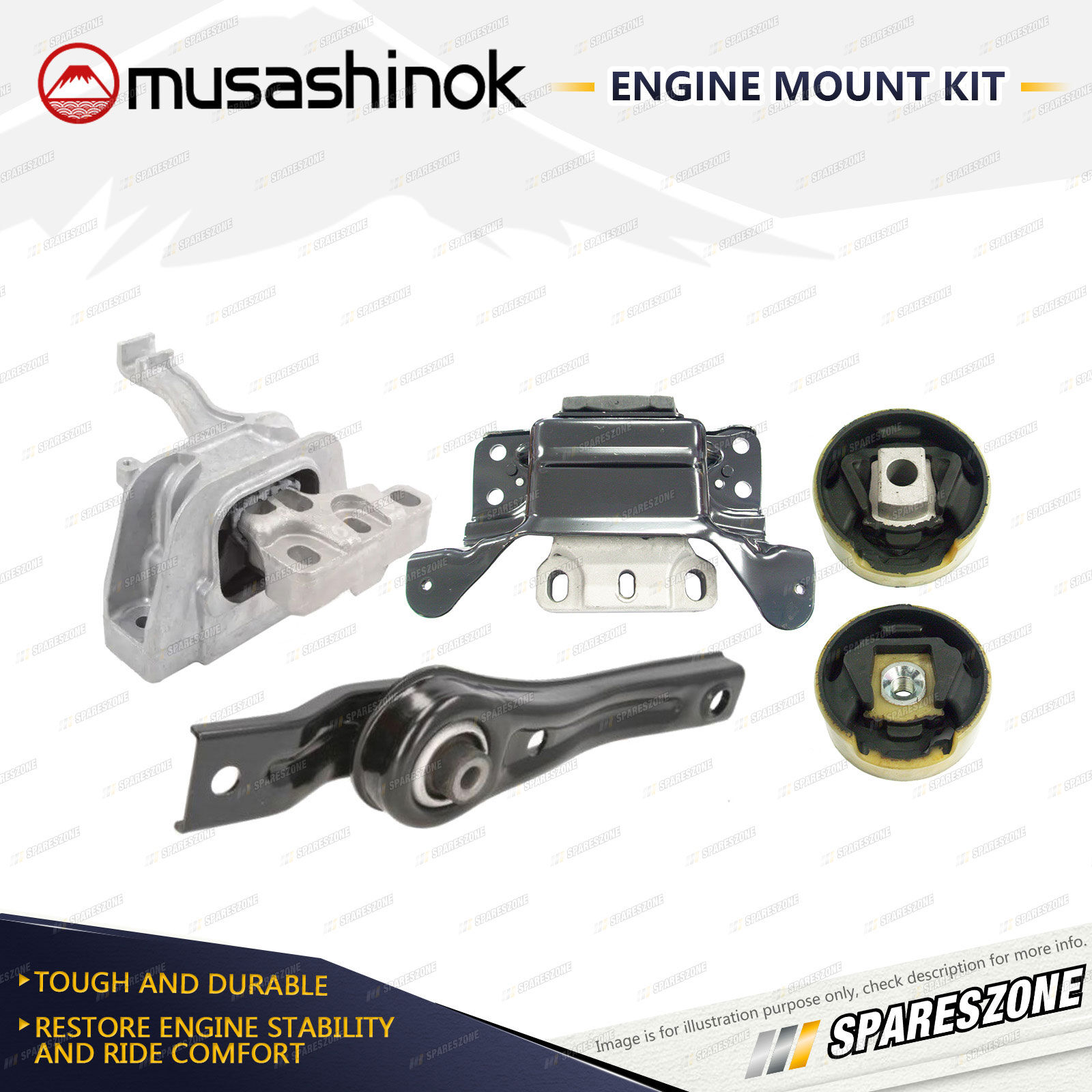 ![]() | About Engine Mounts : Musashinok engine mounts are manufactured to OE standard and very high quality, which is vital given the additional pressure on today's engine mounts.The Musashinok Engine Mount range sets new standards for quality whether manufactured in rubber or urethane.Musashinok's unique urethane design provides rubber-like smoothness and combined with urethanes durability, gives an added advantage over similar products manufactured with rubber. This makes them an ideal product for use in taxis and other commercial fleets. |