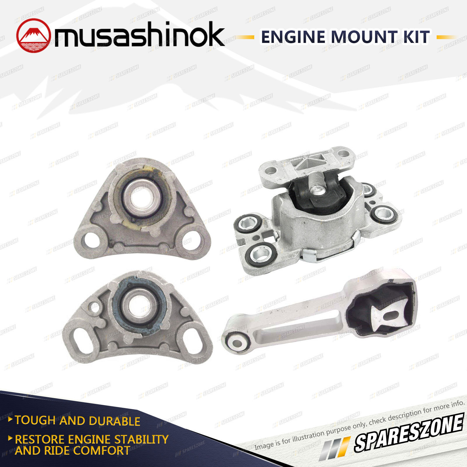 ![]() | About Engine Mounts : Musashinok engine mounts are manufactured to OE standard and very high quality, which is vital given the additional pressure on today's engine mounts.The Musashinok Engine Mount range sets new standards for quality whether manufactured in rubber or urethane.Musashinok's unique urethane design provides rubber-like smoothness and combined with urethanes durability, gives an added advantage over similar products manufactured with rubber. This makes them an ideal product for use in taxis and other commercial fleets. |