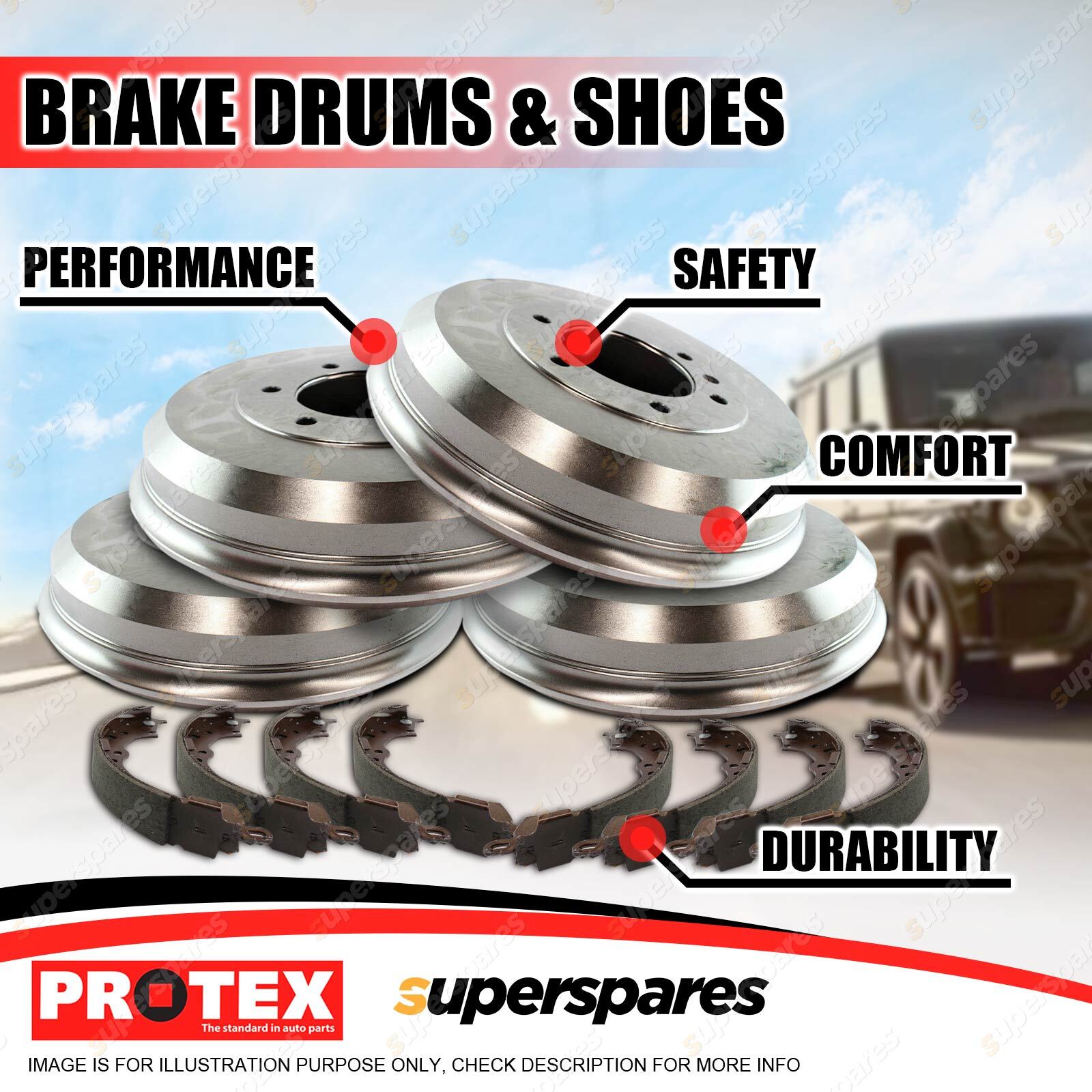 Contents : Protex Front + Rear Brake Drums & Brake Shoes