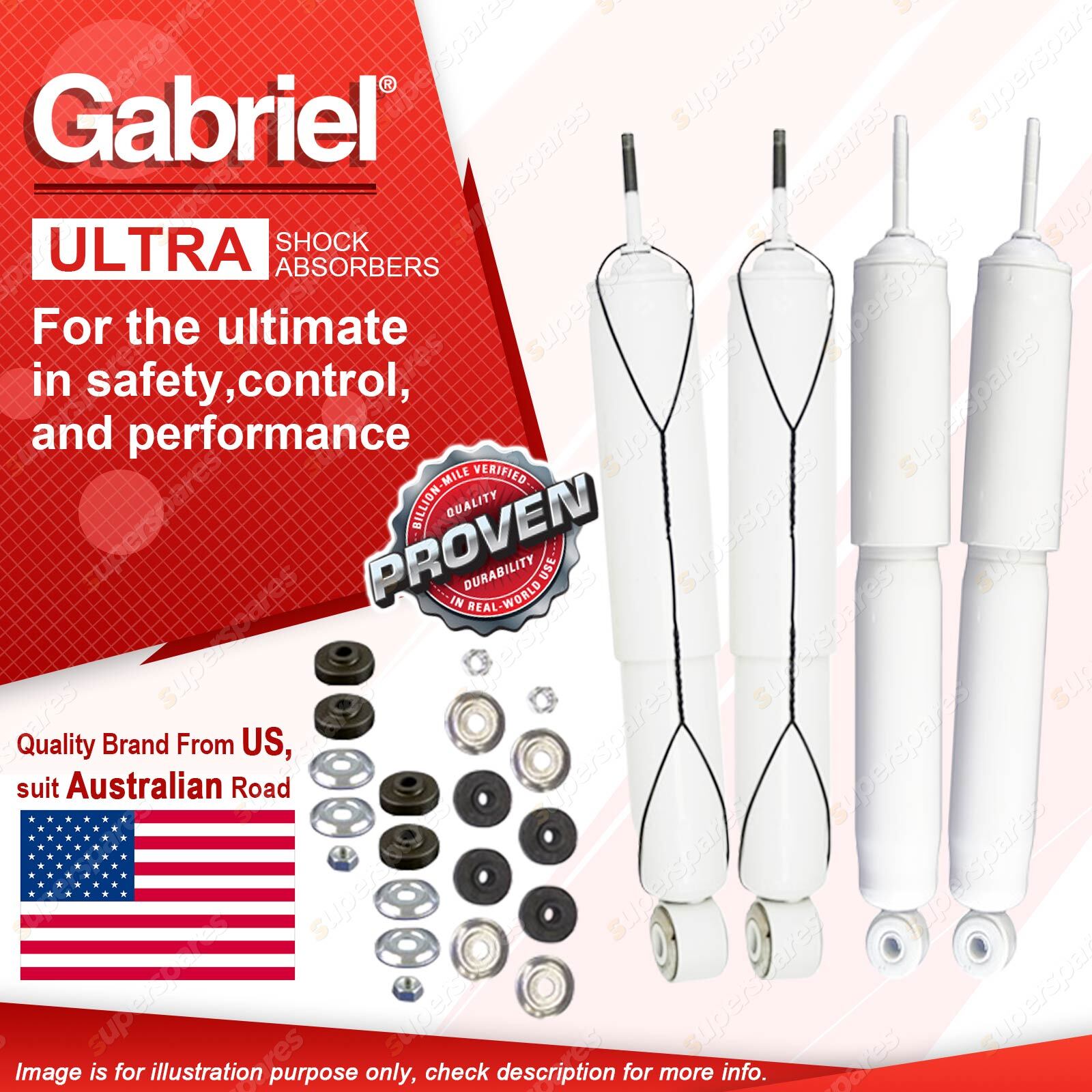| Note: eBay's compatibility table is not accurate in some cases. Please refer to the following information we have provided for you. Copyright © 2014 - 2023 Superspares. All rights reserved. Contents : 2 x Front Gabriel Ultra LT Shock Absorbers - Gas 2 x Rear Gabriel Ultra LT Shock Absorbers - Gas Warranty : 3 Years Suit : Holden (GMH) Frontera MX 4WD 2/99-6/04 |