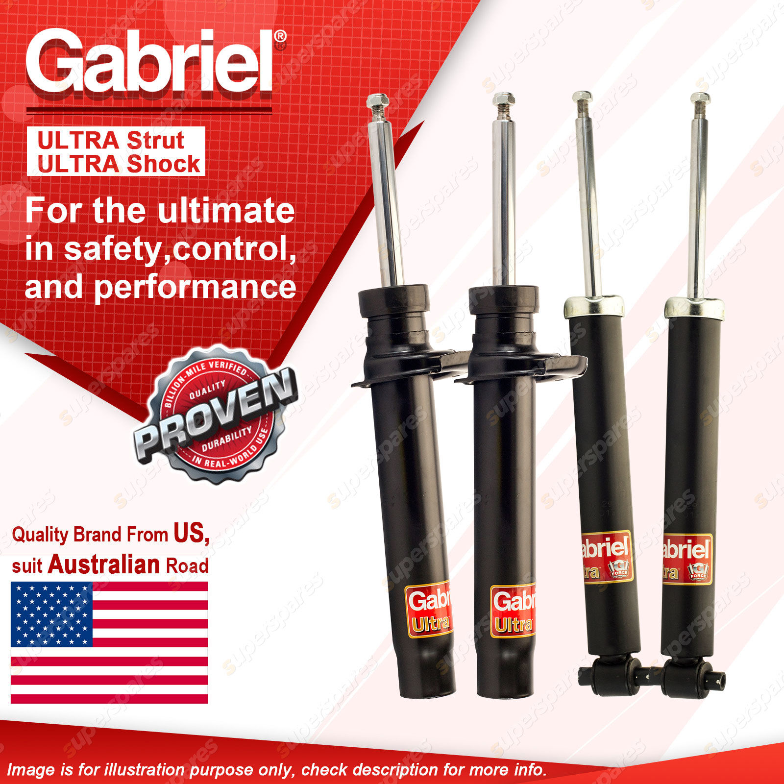 | Note: eBay's compatibility table is not accurate in some cases. Please refer to the following information we have provided for you. Copyright © 2014 - 2025 Superspares. All rights reserved. Contents : 2 x Gabriel Front Ultra Strut Shock Absorbers - Gas 2 x Gabriel Rear Ultra Shock Absorbers - Gas Warranty : 3 Years Suit : BMW 1 Series F20,F21 116i, 118D, 118i, 120i, 125i excl. Sport Suspension & xLine 10/11-On |