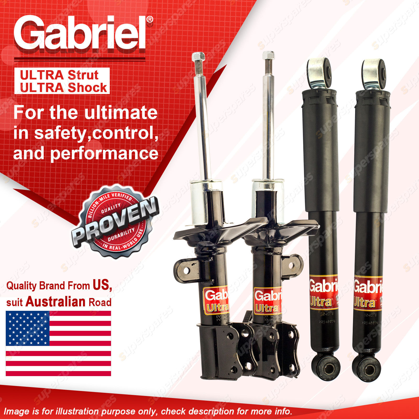 | Note: eBay's compatibility table is not accurate in some cases. Please refer to the following information we have provided for you. Copyright © 2014 - 2025 Superspares. All rights reserved. Contents : 2 x Gabriel Front Ultra Strut Shock Absorbers - Gas 2 x Gabriel Rear Ultra Shock Absorbers - Gas Warranty : 3 Years Suit : Suzuki Alto GF 1.0L Hatch 7/09-1/15 |